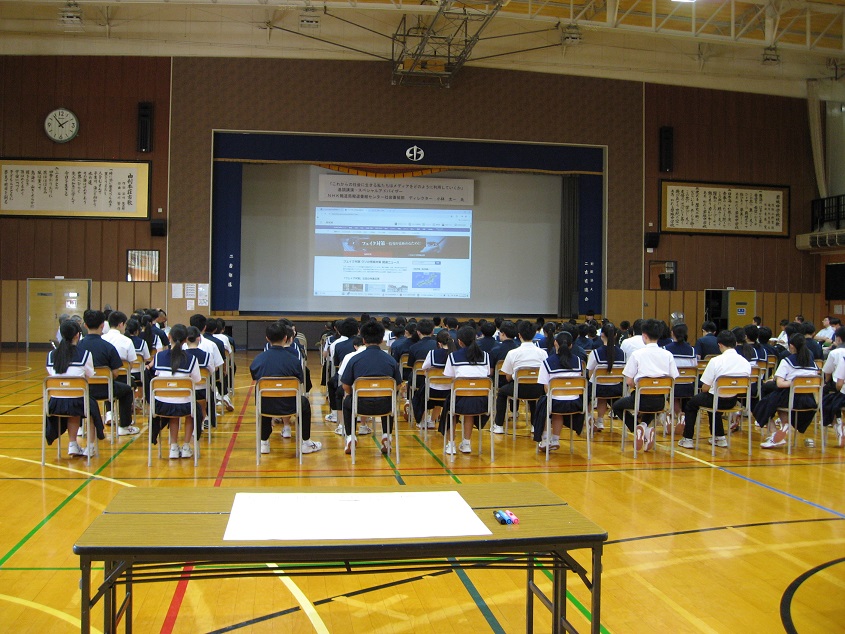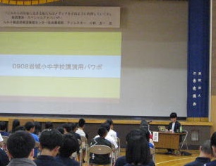 最初に、小林太一氏(NHK報道局 報道番組センター社会番組部ディレクター)を講師として、今回のテーマ「これからの社会に生きるわたしたちはメディアをどう利用していくか?」について、岩城中学全校生徒と岩城小学校6年生、地域の方などが参加し、基調講演が行われました。