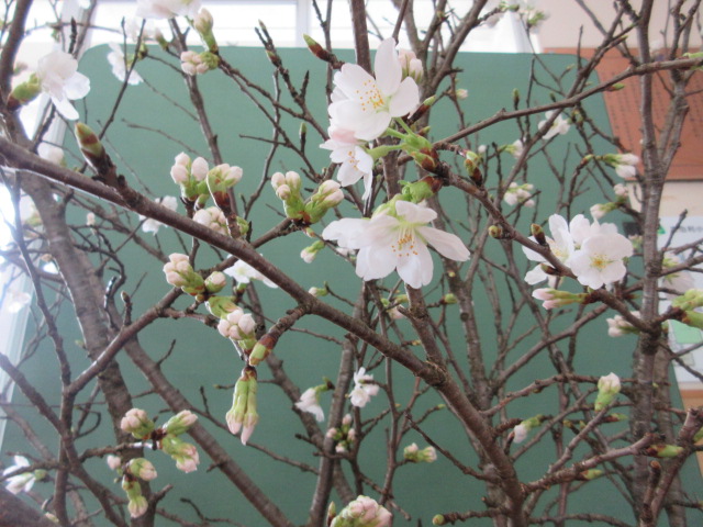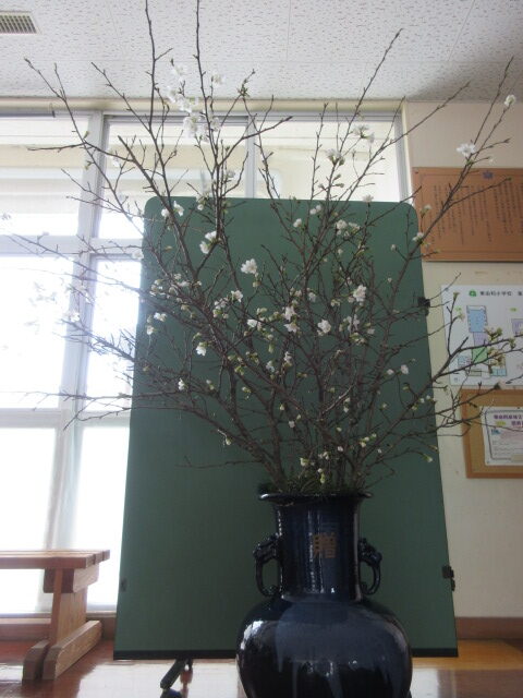学校周辺の桜の木の枝をちょっと拝借。卒業式当日、桜の咲く玄関ホールで卒業生を迎えられるようにと、温かい保健室で温度調整をしながら校務員さんが管理してくれていました。
