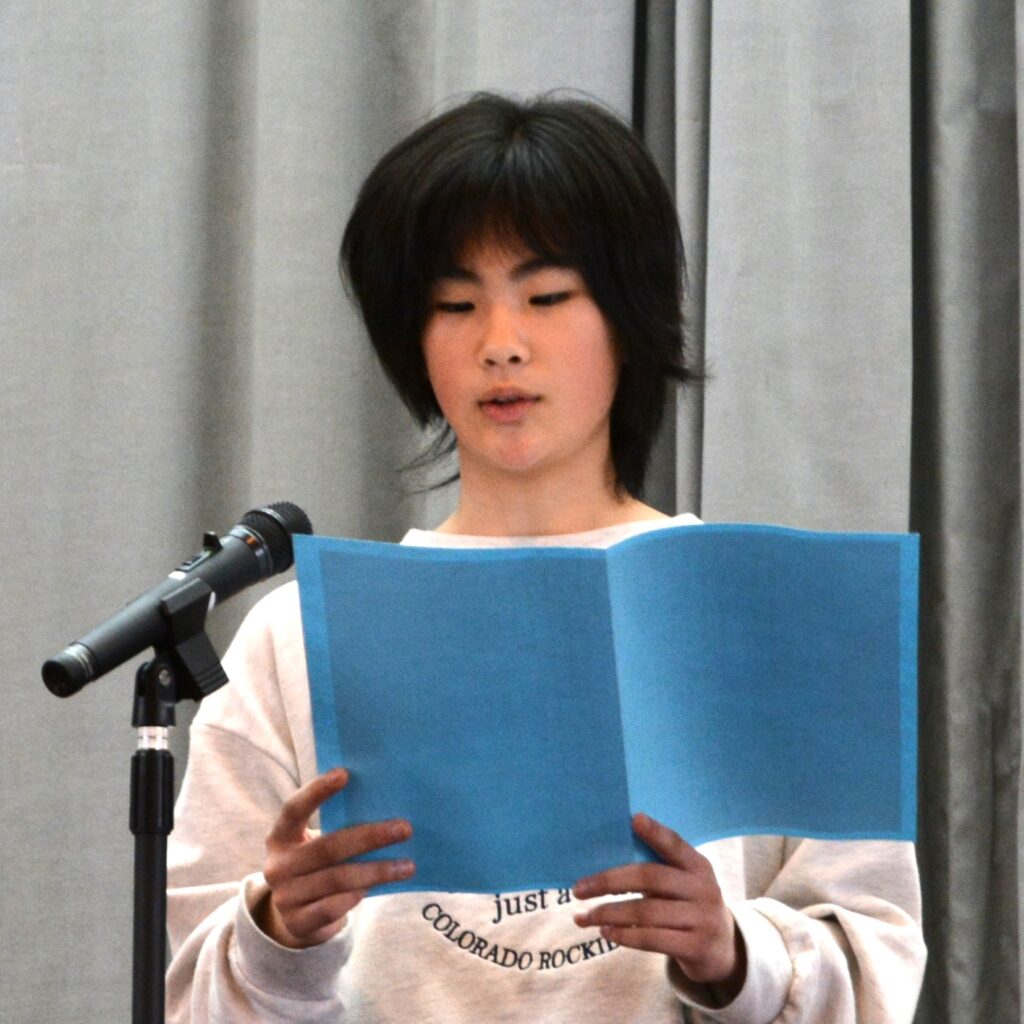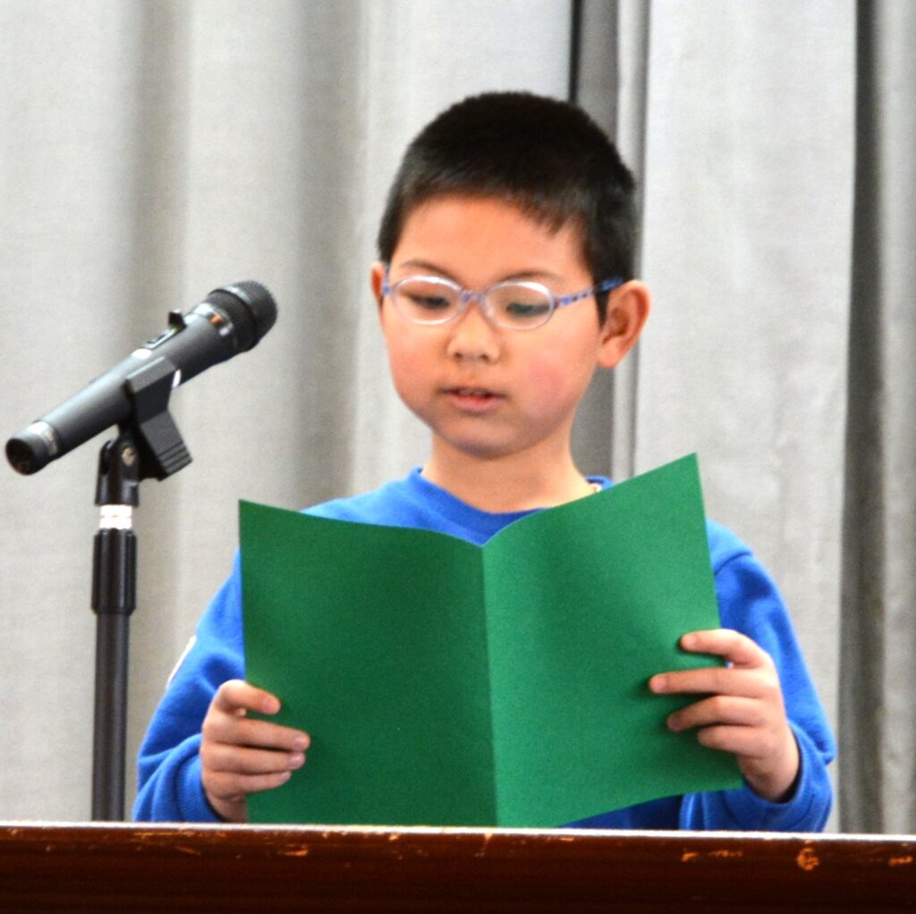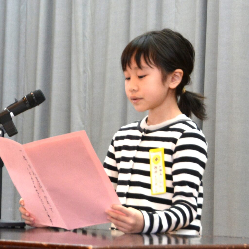 校長の話の後に、1、3、5年生の代表者が作文発表。1年間のがんばりと次年度の抱負を、しっかりと語りました。