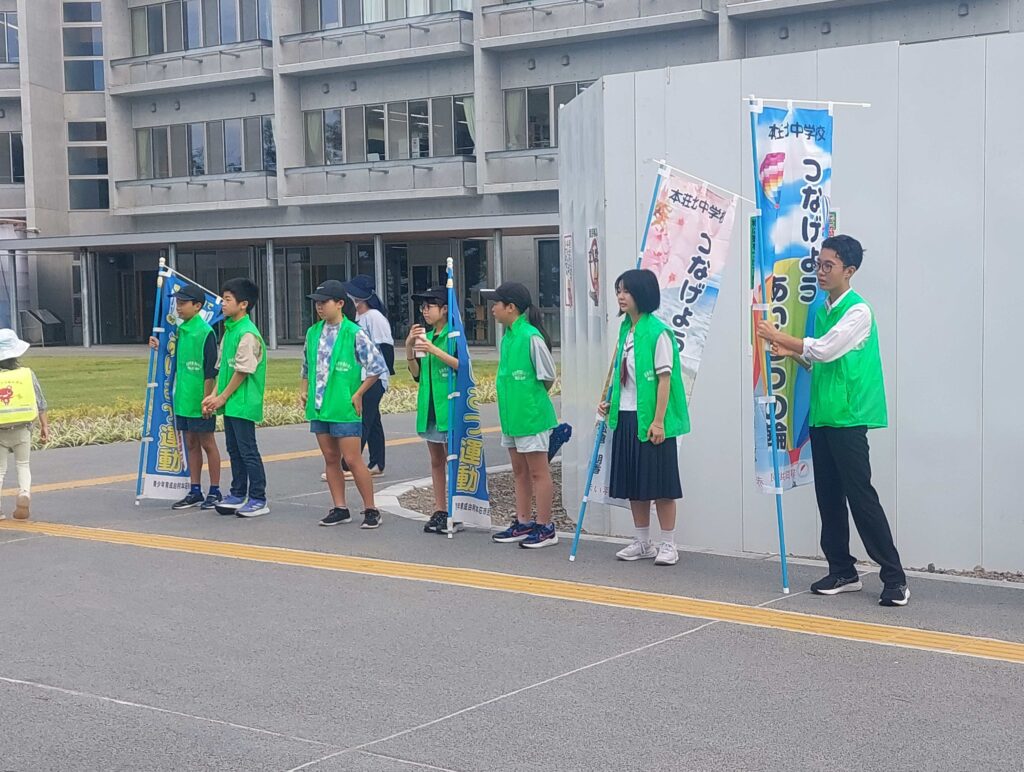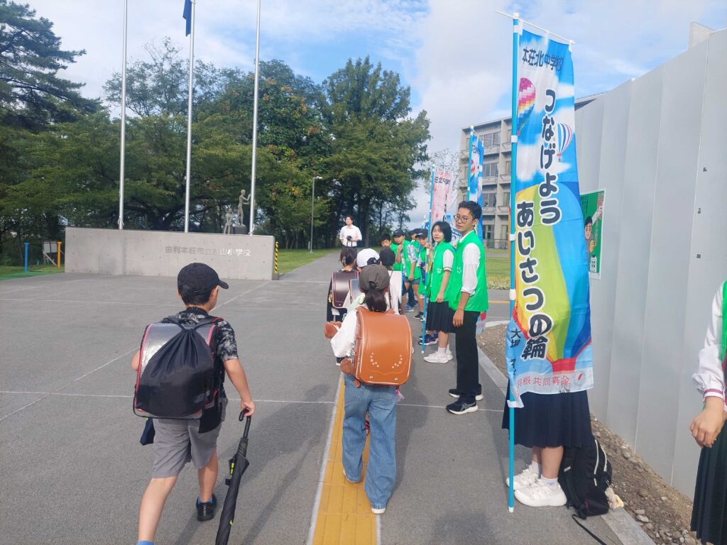 9月8日(月)の朝に、新山小学校で新山小学校児童会と本荘北中学校生徒会の役員による小中合同あいさつ運動が行われました。次回は、11月10日(月)の予定です。