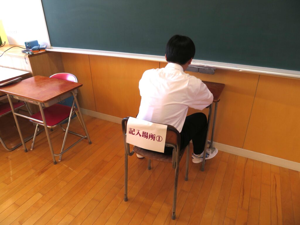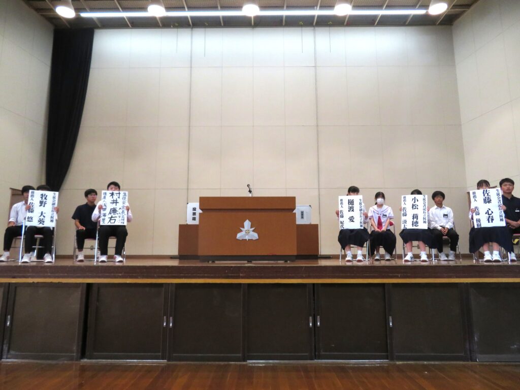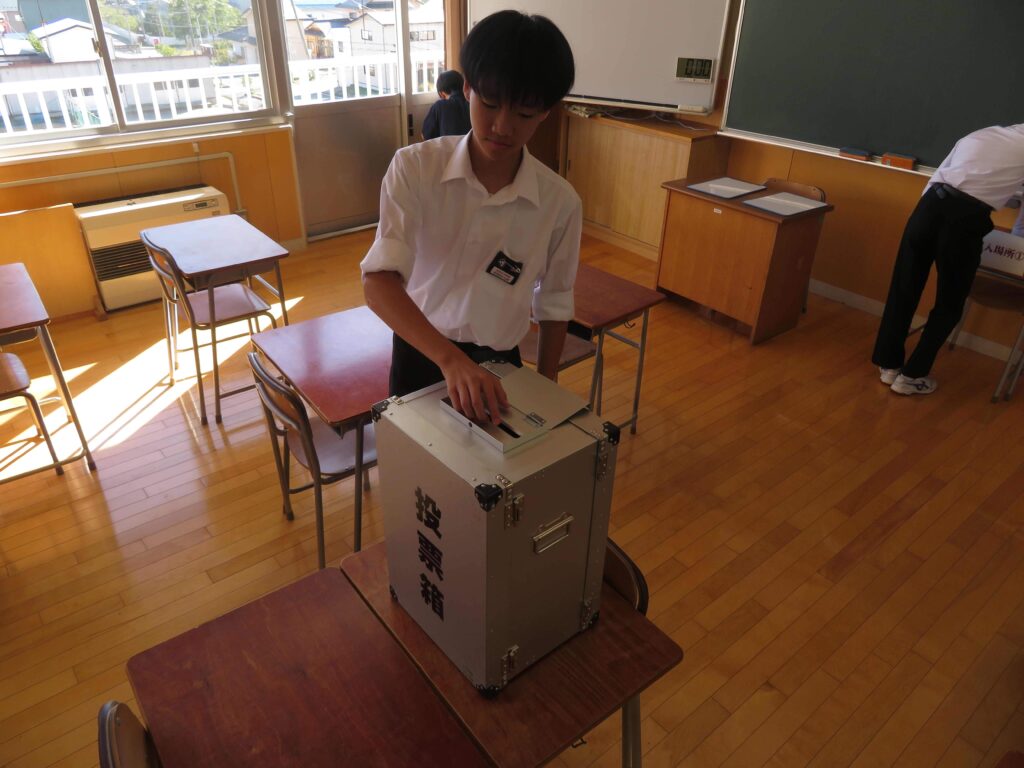 10月8日(水)の5校時に、生徒会役員立会演説会及び投票が行われ、新しい生徒会役員が決定しました。投票は、各学年の学習室に設けられた投票所で、由利本荘市選挙管理員会よりお借りした投票箱を使って行われました。