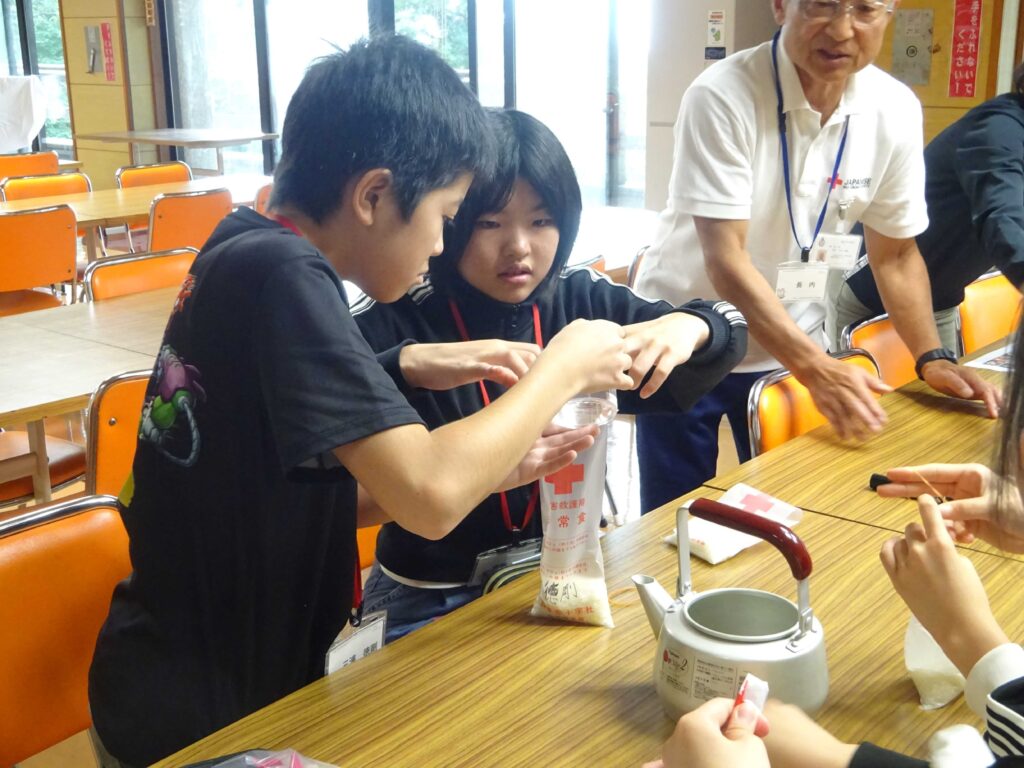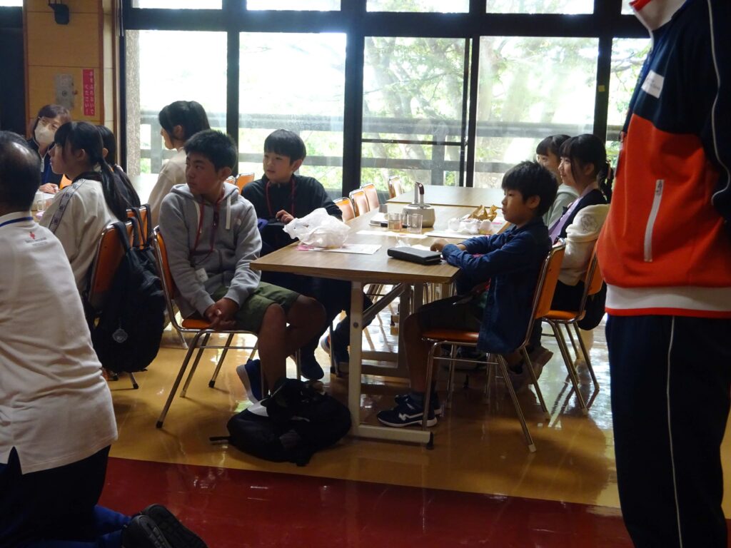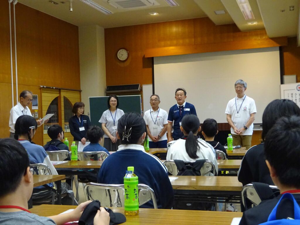 日本赤十字社秋田県支部と秋田県青少年赤十字指導者協議会が主催するこの事業は、「リーダーシップを学ぶこと」を目的とし、毎年県内各地で開催されています。今年は本荘由利地区での開催年で、岩城少年自然の家が会場でした。岩城小学校からは、6年生と5年生から2名ずつの4名が参加しました。他校の子どもたちと協力しながら、非常炊き出しや一次救命処置、グループワークなどを体験しました。