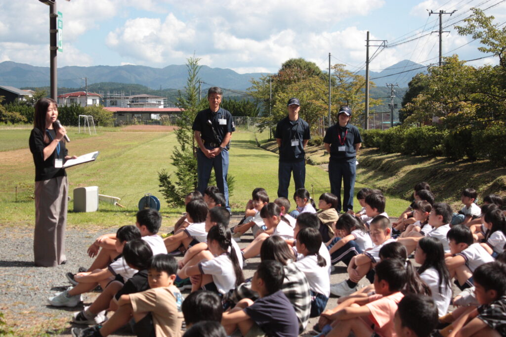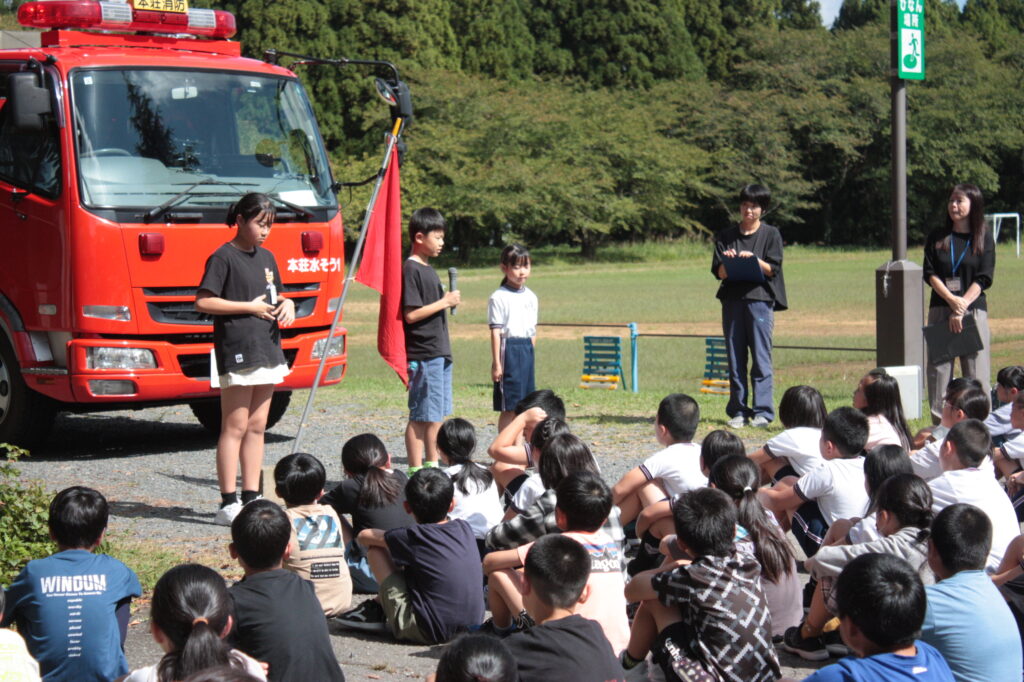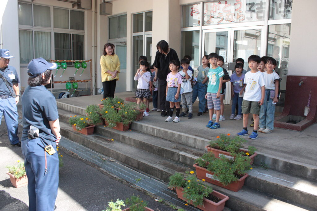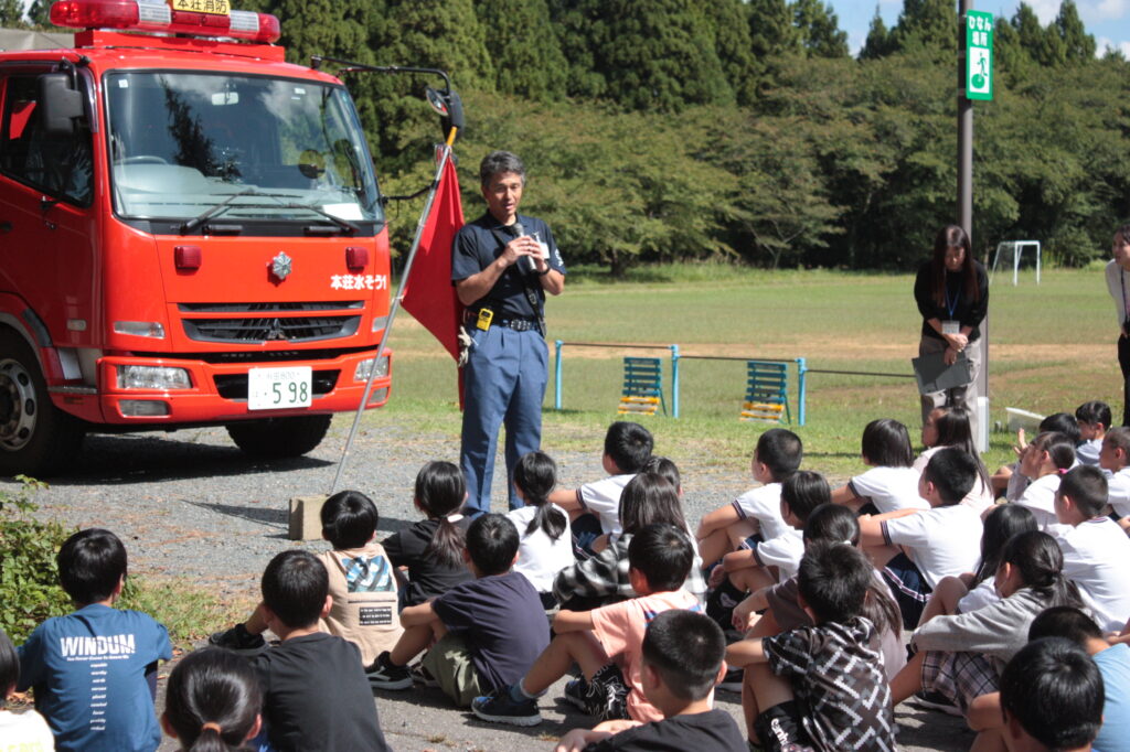 子どもたちは「自分の命は自分で守る」ために、合言葉「おはしも」をしっかり守り、整然と外の駐車場に避難しました。整然と避難する態度、口を閉じて見て話を聞く子吉っ子の態度に、消防署の方からお褒め言葉をいただきました。