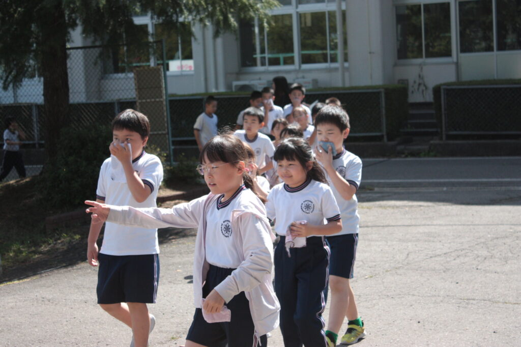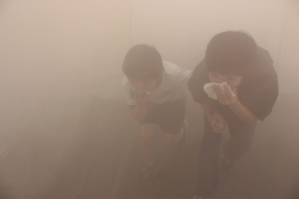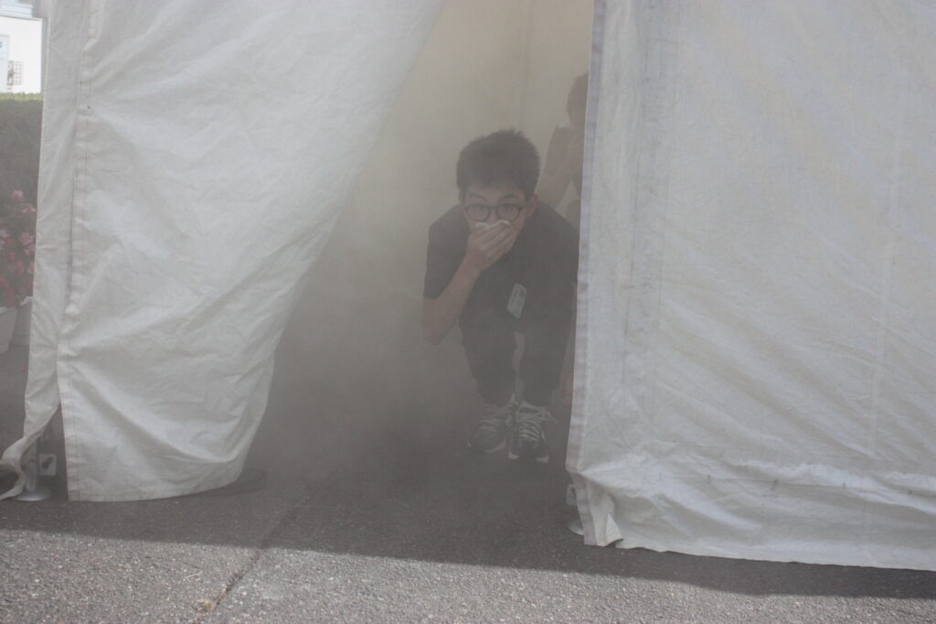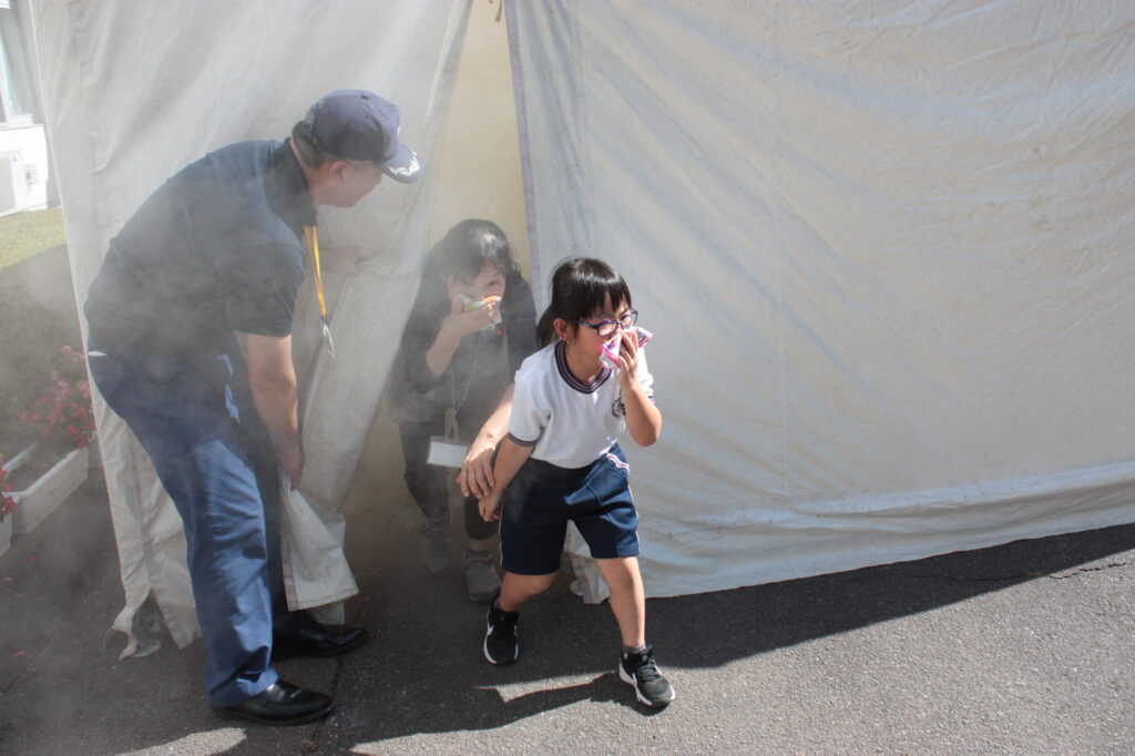 今回は、避難訓練の前に、玄関前の煙体験ハウスで、煙の中を歩く体験も行いました。視界を確保し、有害な煙を吸わないために身をかがめて歩くことの大切さを、全校児童が体験しました。