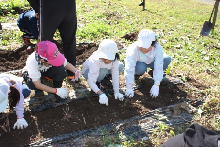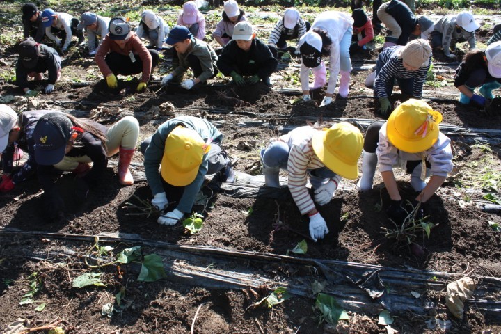 サツマイモの茎の部分の土を慎重に両手で土を取り除いていくと、紫色の大きなイモがいくつも出てきました。子どもたちは、大きな歓声を上げながら、たくさんイモを掘っていました。一つのツルに8本もイモが付いている子や、自分の顔よりも大きなイモを掘り上げる子もいました。