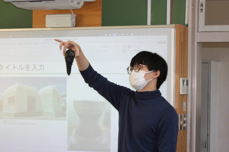 名前は聞いたことはあるものの、3Ⅾプリンタの実物を見るのは初めての子が多く、どんなことができるのか、実際どんなものが作られているのかなど、みんな興味津々で説明を聞いていました。