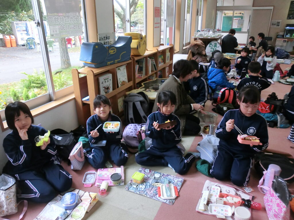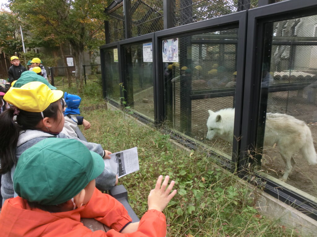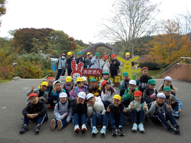 1・2年生が秋田市の大森山動物園「オモリンの森」に校外学習に行きました。秋晴れの下、子どもたちは元気いっぱいで、動物園の中を巡りました。おなじみのゾウやキリンの他に、オオカミやトラなど珍しい動物に大興奮でした。