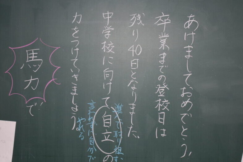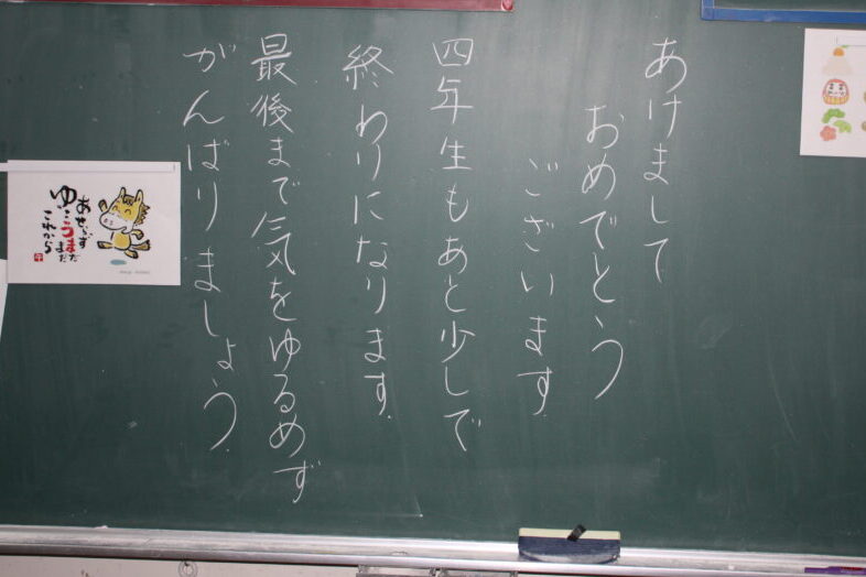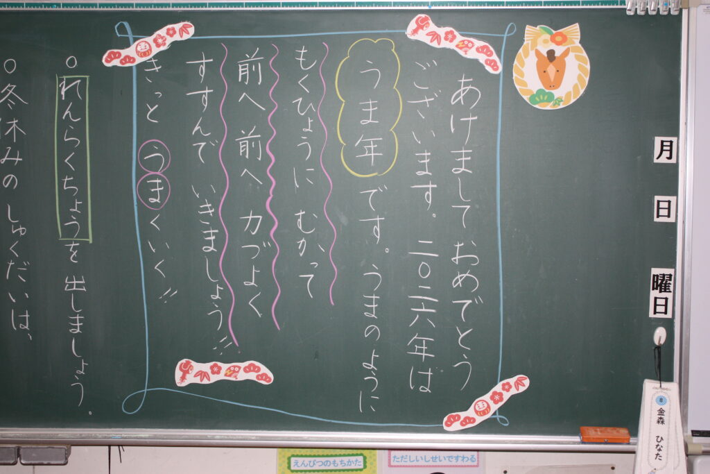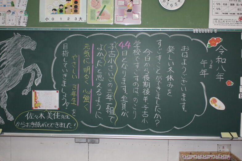 校長あいさつでは、午年にちなんで「塞翁が馬」という中国の故事成句を紹介しました。もし何か失敗してもがっかりしないで、『これがいいことに変わるかもしれない!』と前を向いてください。逆にいいことがあった時は、『もっといいことにつなげよう』と、努力を続けてください。3か月後に子吉小学校が閉校するという残念なことがある今年ですが、本荘東小学校に行く1~5年生、中学校に進学する6年生、皆さんの新しい年が、たくさんの「いいこと」に変わっていく、素敵な1年になるように応援しています。そのためにも、一人一人が目の前のあたり前のことをしっかりやること、『凡事徹底』をがんばっていきましょう!」と、お話ししました。