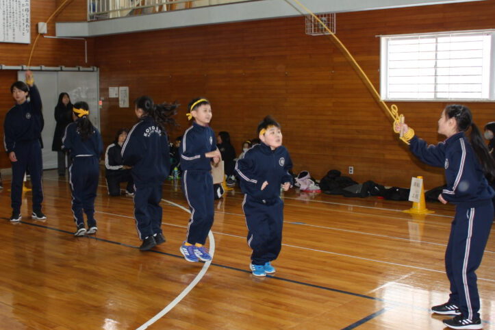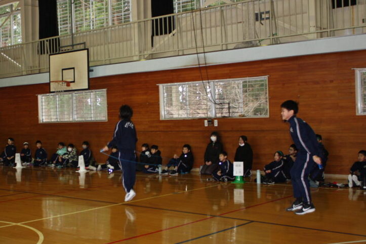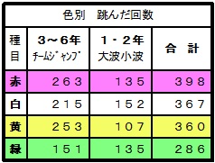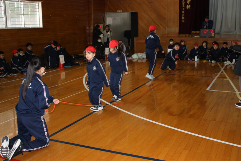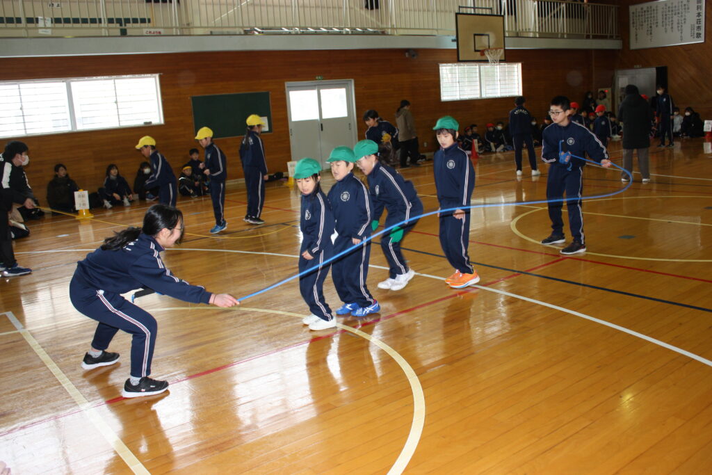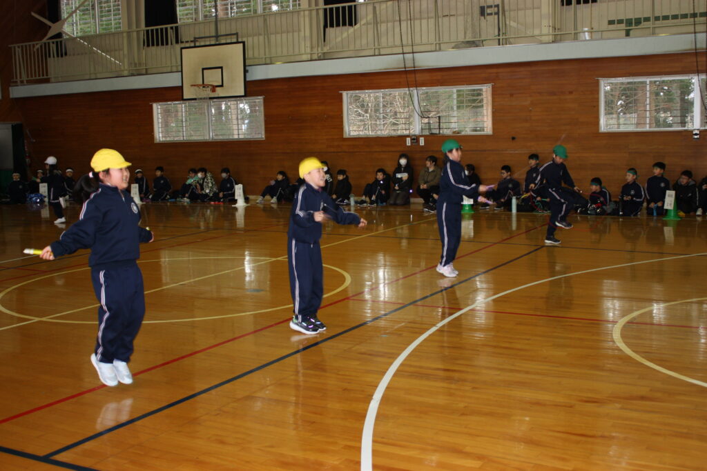その後、各色の1~4班が順番に3~6年生はチームロープジャンプ、1・2年生は大波小波を行い、時間内に跳んだ回数の色別の合計を競いました。これまでの練習の成果を発揮し、どの班もたくさん跳ぶことができました。自分の色を応援したり、跳んだ回数を数えたりする元気な声が、体育館中に響いていました。