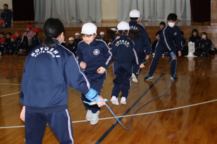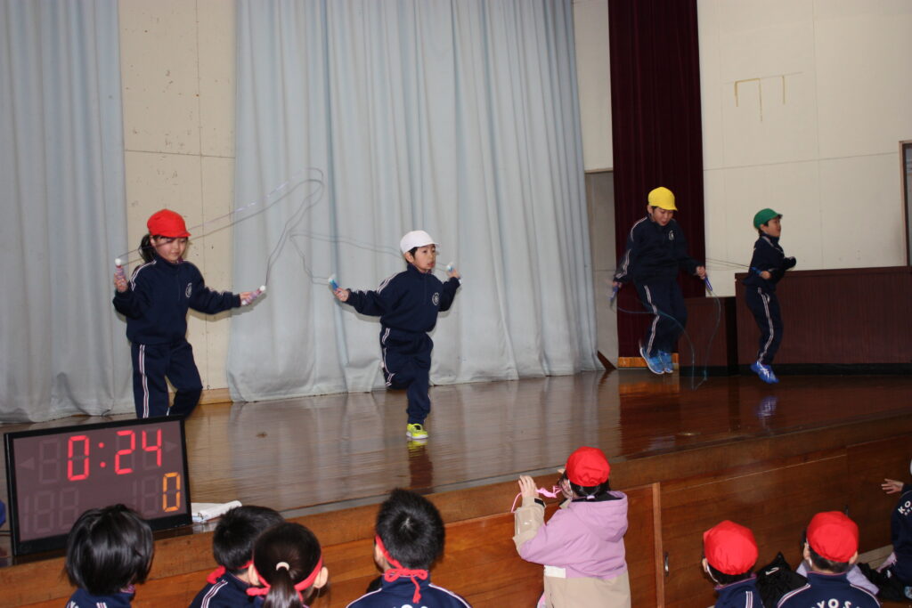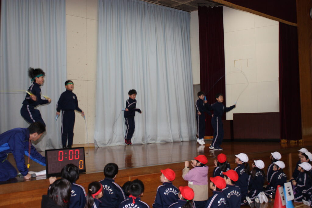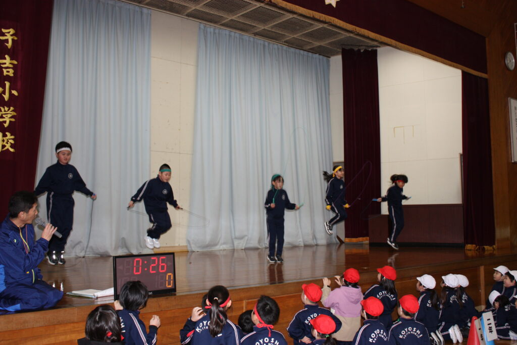 次に、各学年の代表者がステージや体育館中央で、得意な技を披露しました。学年が進むにつれて、二重跳びや交差二重跳び、ハヤブサなど、高難度の技を見せていました。