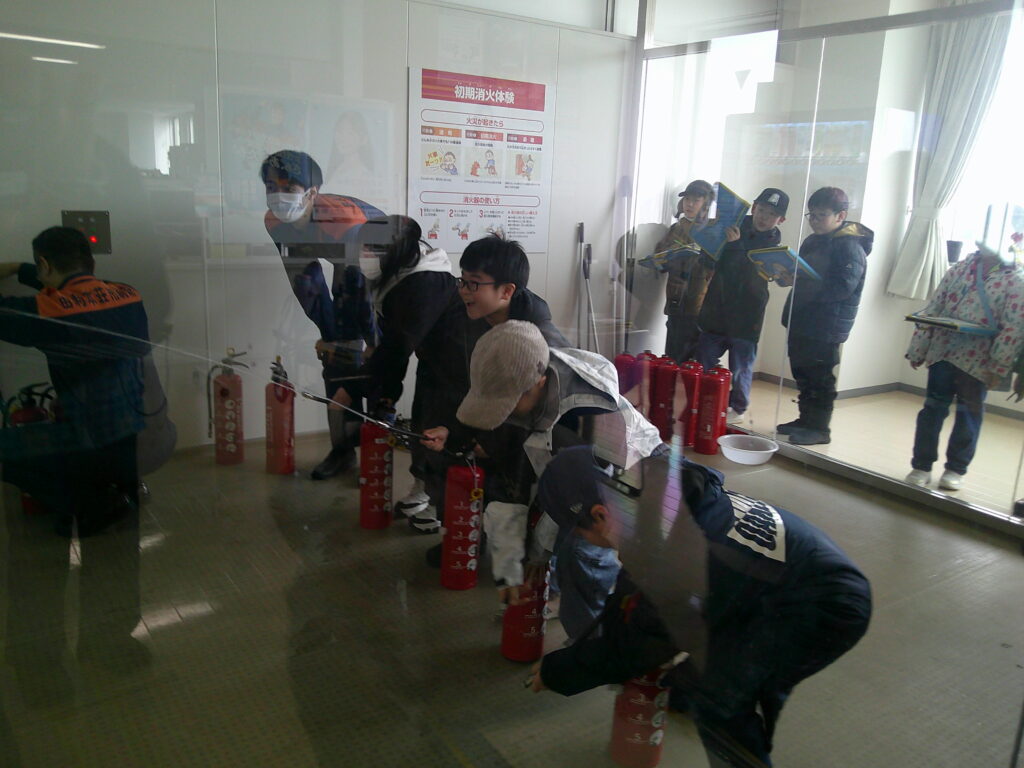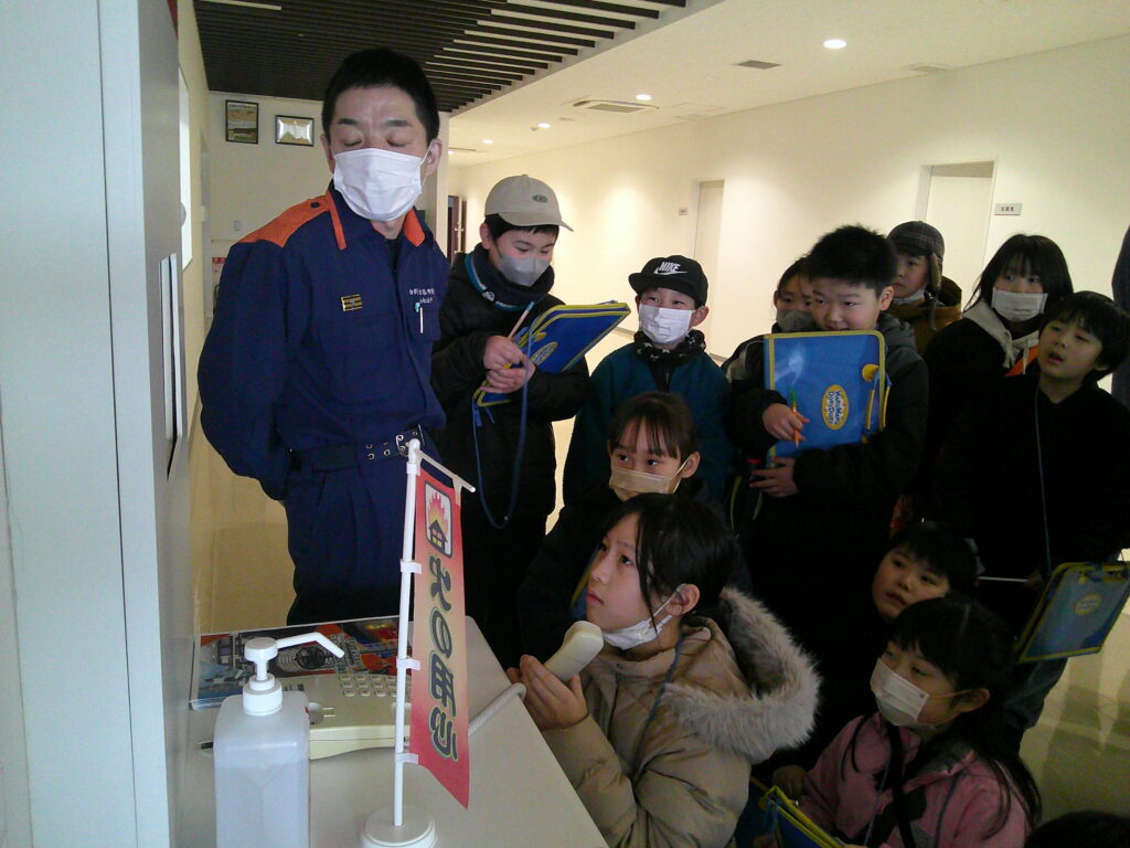 消防本部では、大きな新しい建物の中で動画を視聴後、担当の方から建物についての説明の後、119番通報をしたときの電話体験や、消火器を使った消火体験等もさせていただきました。