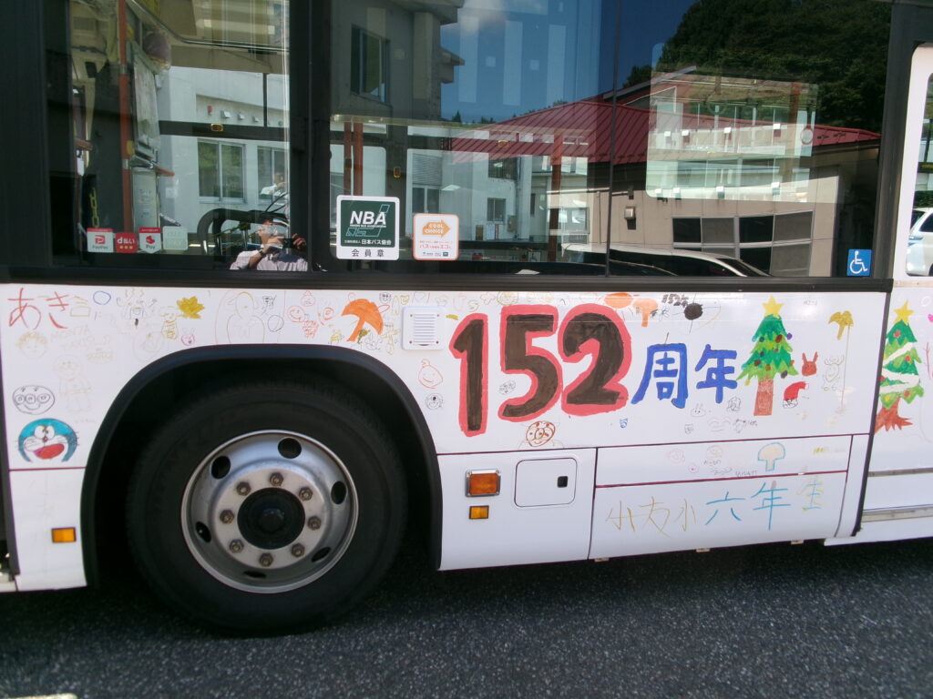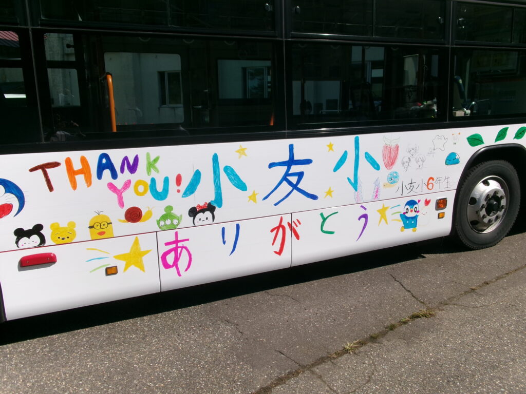 9月30日(火)は晴天のもと、6年生を対象に「落書きバス・バス乗り方教室」が開催されました。バスの乗り方について説明を受けたり、運転席に座ったりしながら、羽後交通の方からお話をお聞きました。また、バス車体側面のラッピング部分には、閉校に関わる思いを落書きで表しました。このバスは1ヶ月半ほど、実際に路線を走ります。さらに、10月17日(金)のミニマラソン大会では本校駐車場に展示されます。お楽しみに!