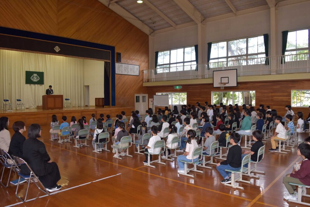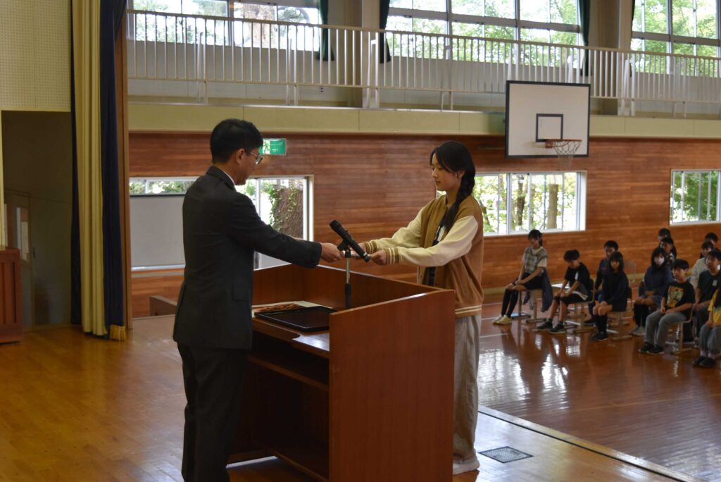 10月9日(木)は前期終業式が行われました。2年・4年・6年代表者による作文発表の他、全校漢字テスト計4回、全校計算テスト計4回において、全て満点だった児童がそれぞれ漢字博士・計算名人として表彰されました。