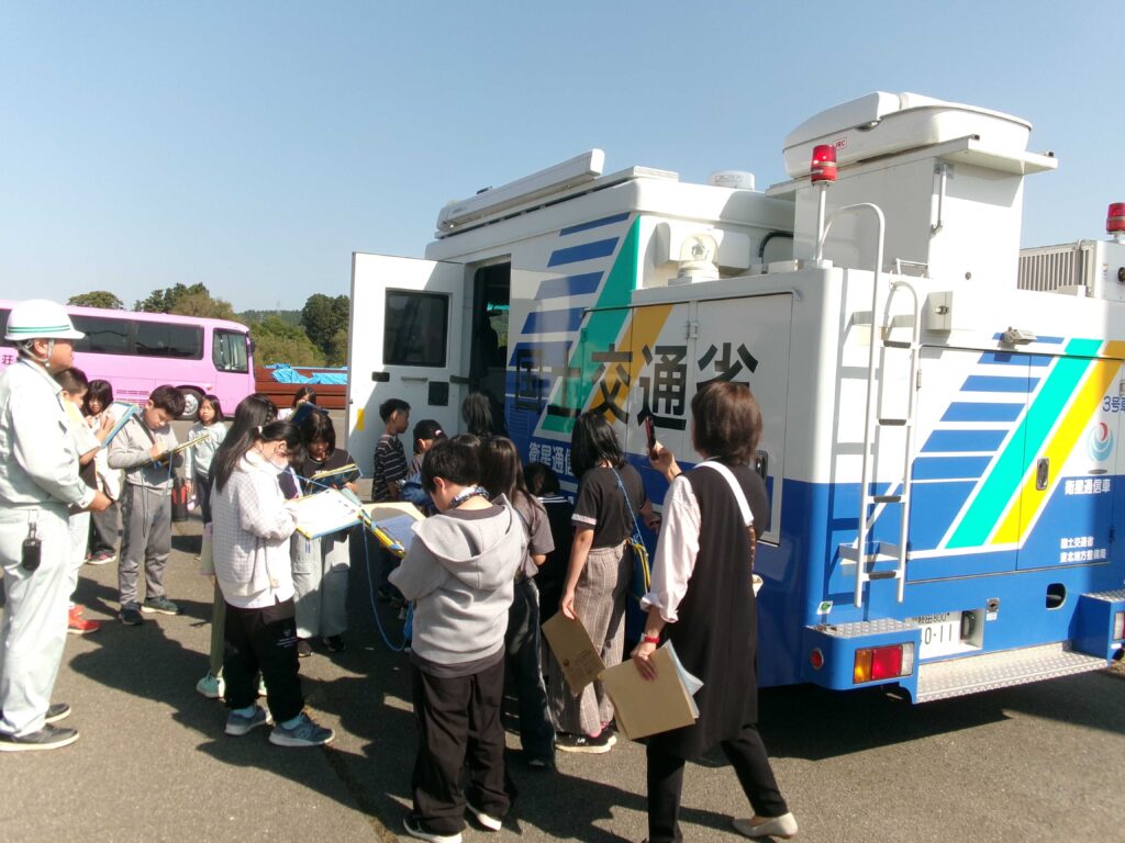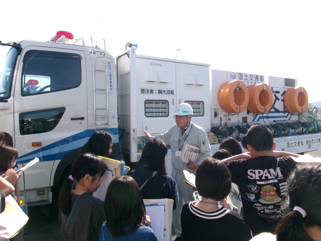 10月15日(水)、4年生が学区内にある子吉川防災ステーションを見学しました。ここは洪水や地震など災害時の復旧活動の拠点となっています。子吉川における水害の歴史の話を聞いた後、衛生通信車、土のう造成車、照明車、排水ポンプ車、対策本部車、待機支援車を見せていただきました。
