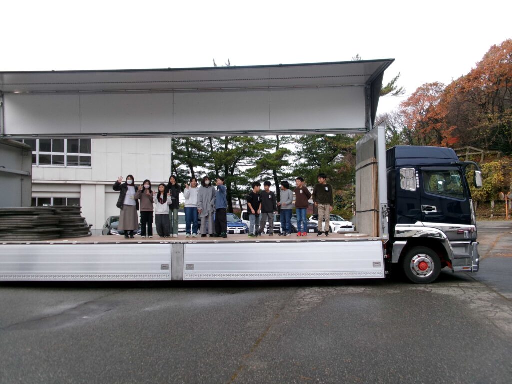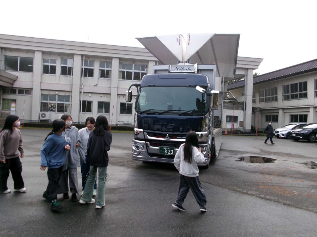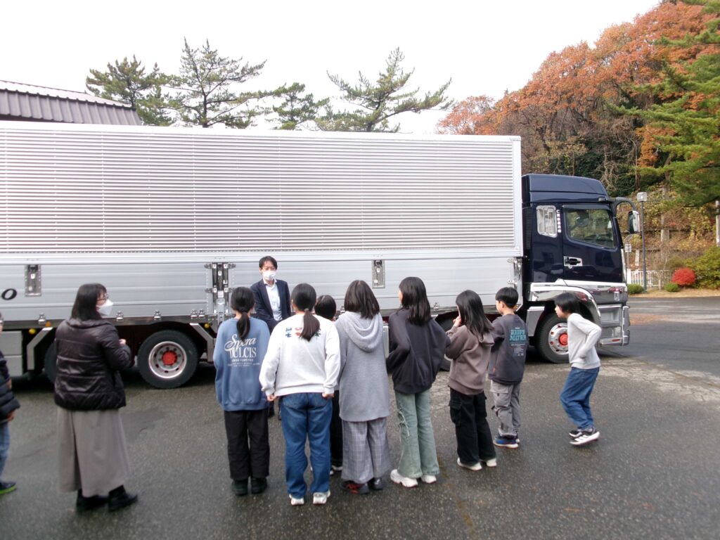 11月25日(月)は、秋田県トラック協会の方をお迎えして、5年生が物流についての学習を行いました。トラック協会の方からは、「どのようにして荷物をトラックが運んでいるのか」「トラック輸送の利点」等のお話を聞かせていただきました。この後、ウィング車と呼ばれている大型トラックを実際に見せていただきました。「小学生の子どもだったら400人以上の重さの荷物を運ぶことができる」「500リットルの燃料タンク」「12本のタイヤ」などの説明を聞きながら、子どもたちはトラックの大きさに驚くとともに、荷台に上がって大喜びでした。