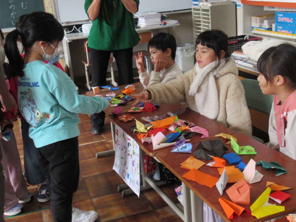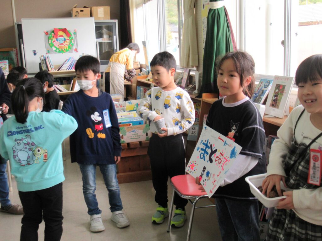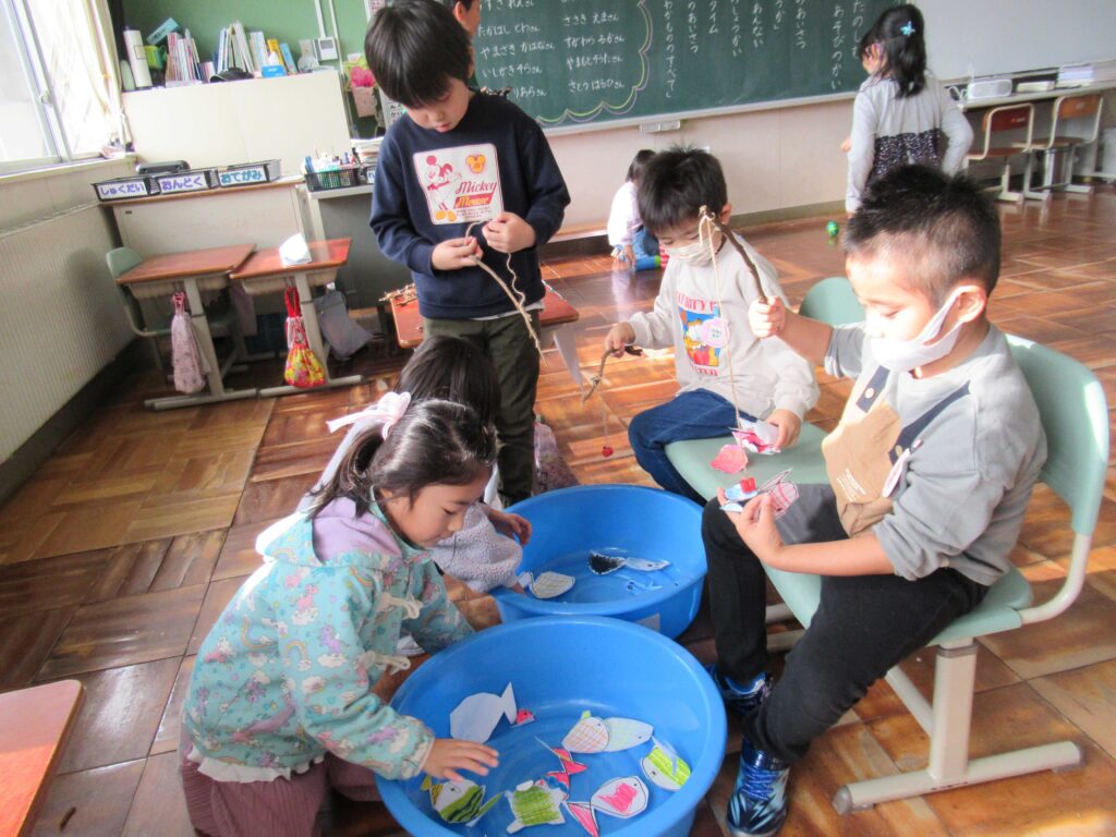 11月27日(木)は、1年生が小友保育園と石沢保育園の年長組を学校に招いて交流しました。準備したおもちゃはどんぐりで作ったコマ、迷路や的当て。松ぼっくりけん玉。磁石を使った魚釣りやペットボトルを使ったボーリングなどなど。10名という少人数の年長さんですが、1年生はお兄さんお姉さんとして成長した姿で、校内を案内したり、手作りのおもちゃで遊ばせたりしました。
