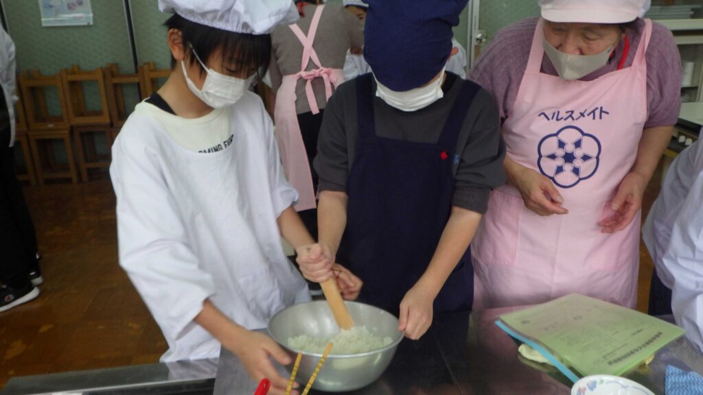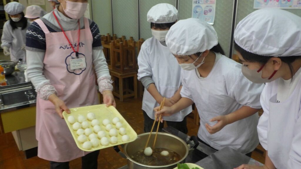 12月9日(火)は、5名の由利本荘市食生活改善推進協議会の方々のご協力のもと、5年生がだまこ汁づくりを行いました。自分たちで田植えをして収穫した「ひとめぼれ」を使って、だまこ餅を作り、鍋にしました。完成しただまこ汁は、みんなでおいしくいただきました。自分たちが収穫したお米を使っただまこ汁は格別のうまさ!おなかいっぱい食べました。