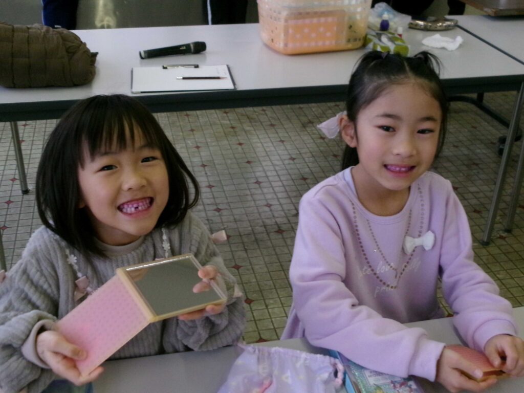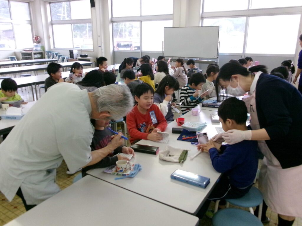 12月15日(月)は、学校歯科医師の藤原先生をお迎えして、1・2年生で移動保健教室が行われました。歯科衛生士さんから歯垢染め出し液を塗ってもらって、どのぐらい磨き残しがあるのか、鏡を使って確認しました。その後、藤原先生から歯磨き指導をしていただきました。これを機に、丁寧に歯磨きするよう、心がけてほしいです。