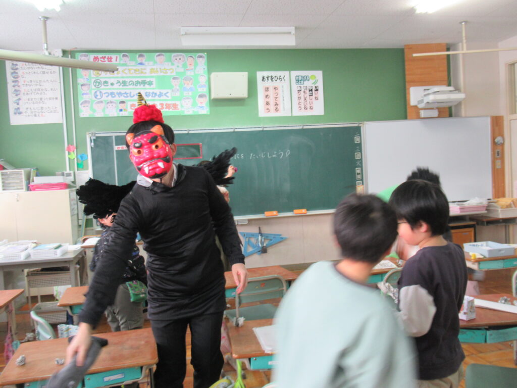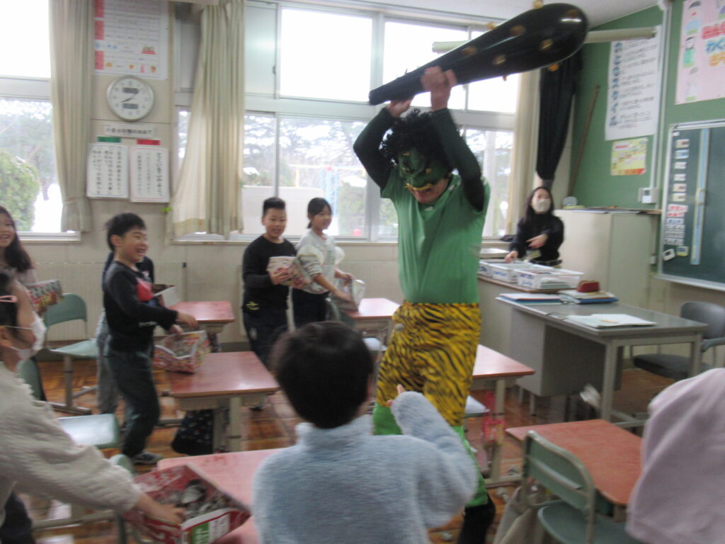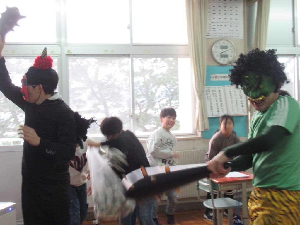 2月3日(火)は節分。小友小では、学年閉鎖になっている6年生以外の教室に緑鬼と赤鬼が出没。子どもたちが鬼退治をしました。子どもたちのパワーに圧倒された鬼たちは、予定よりかなり早く退散していきました。子分の鬼5匹は学年閉鎖で参加できず…