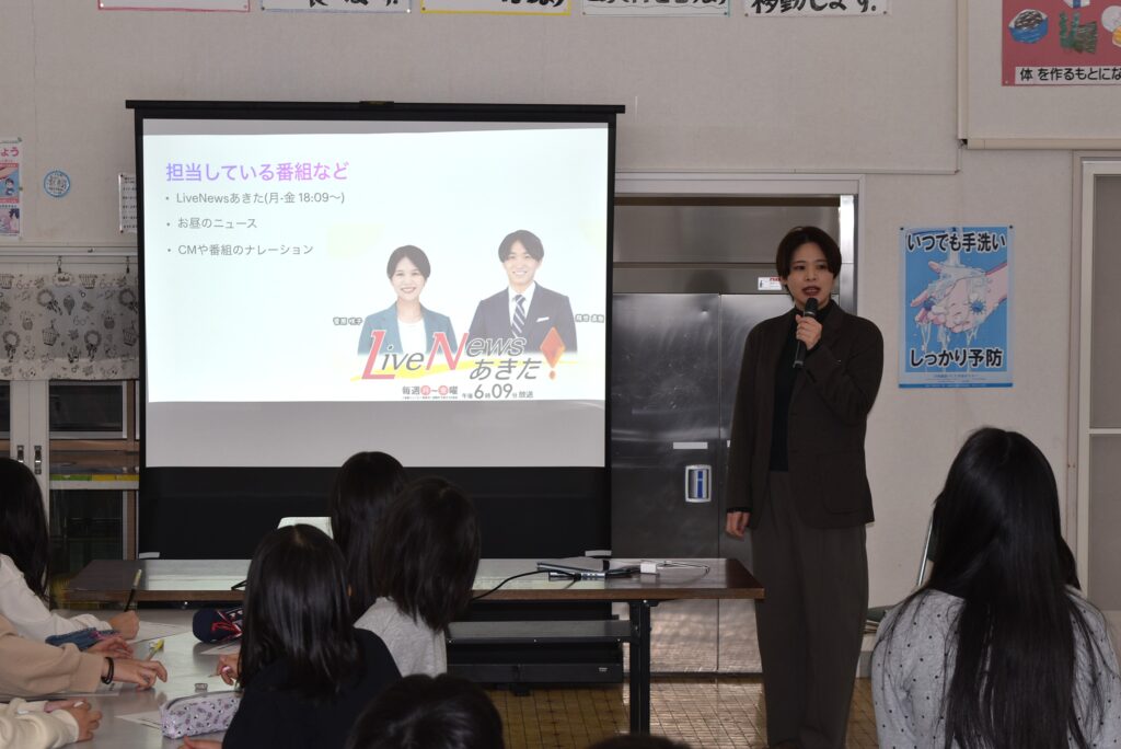 2月19日(木)は秋田テレビアナウンサーの菅原咲子さんをお迎えして講話をいただきました。対象は4~6年です。6年担任である高橋先生とは幼なじみということで、快く講話を引き受けてくださいました。菅原アナウンサーは本荘東中出身ですが、どのようなことを考え、どのように行動することで、希望であったアナウンサーとして活躍できているのか。さらには、アナウンサーの一日など多岐にわたってご講話いただきました。さすが話し方のプロ!全員が引き込まれていました。