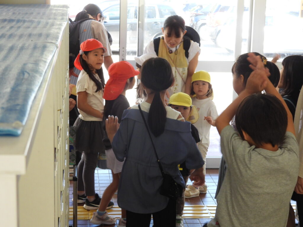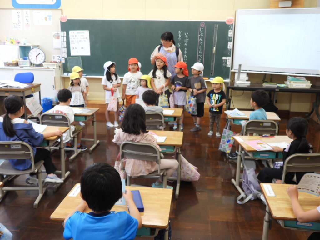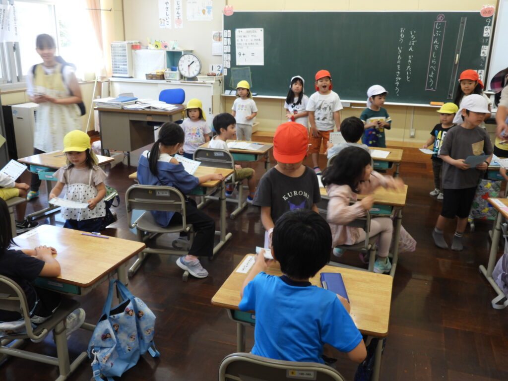 下川大内保育園の年長児うみ組さんが、2歳児のきりん組さんをつれて、保育園の運動会の招待状を1年生一人一人に届けに来てくれました。かわいい来校者に1年生も喜んでいました。