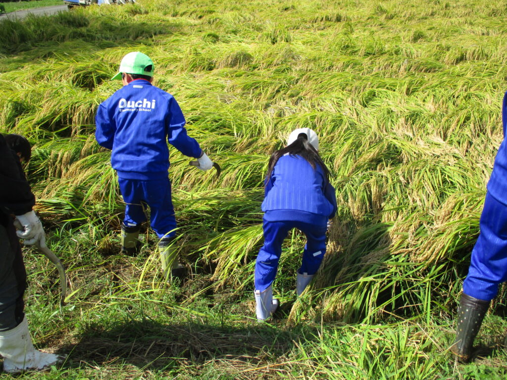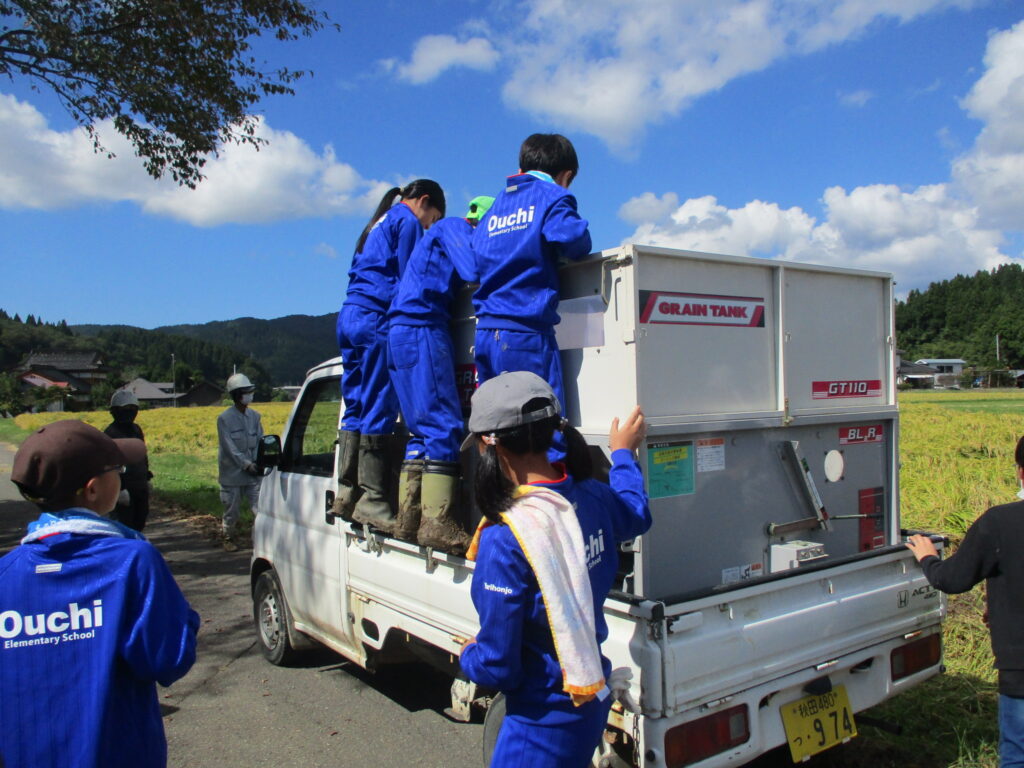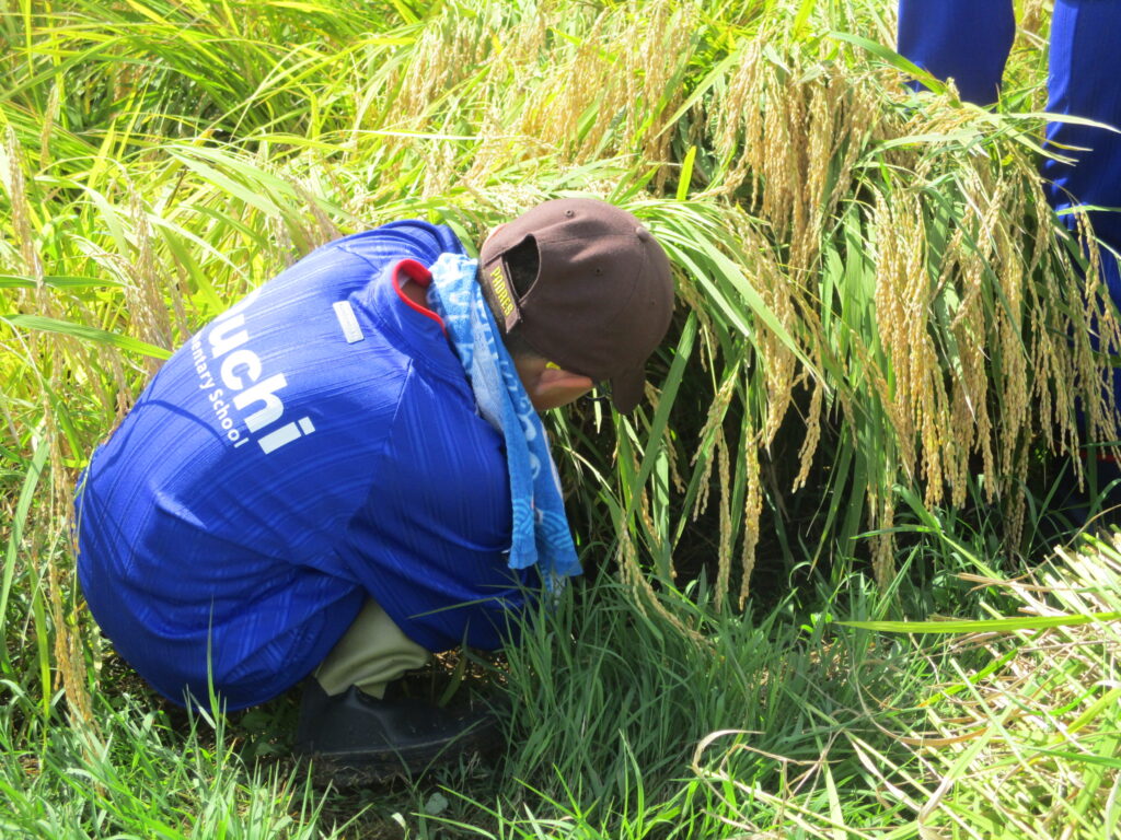 田植え体験をさせていただいた農場の田んぼの稲が収穫の時期になったという連絡をいただき、稲刈りの体験をさせていただきました。今年は、収穫の時期に雨が多かったため、田んぼの中は歩きにくく、長靴で歩くのがやっとでした。鎌で稲を刈る体験や機械での収穫体験もさせていただきました。社会科の学習が活用され、農家の方の苦労や喜びを感じたり、今年の米の収穫状況について質問したりと学習を広げることができました。農家の方の思いが伝わり、食への意識も高まってほしいと思います。