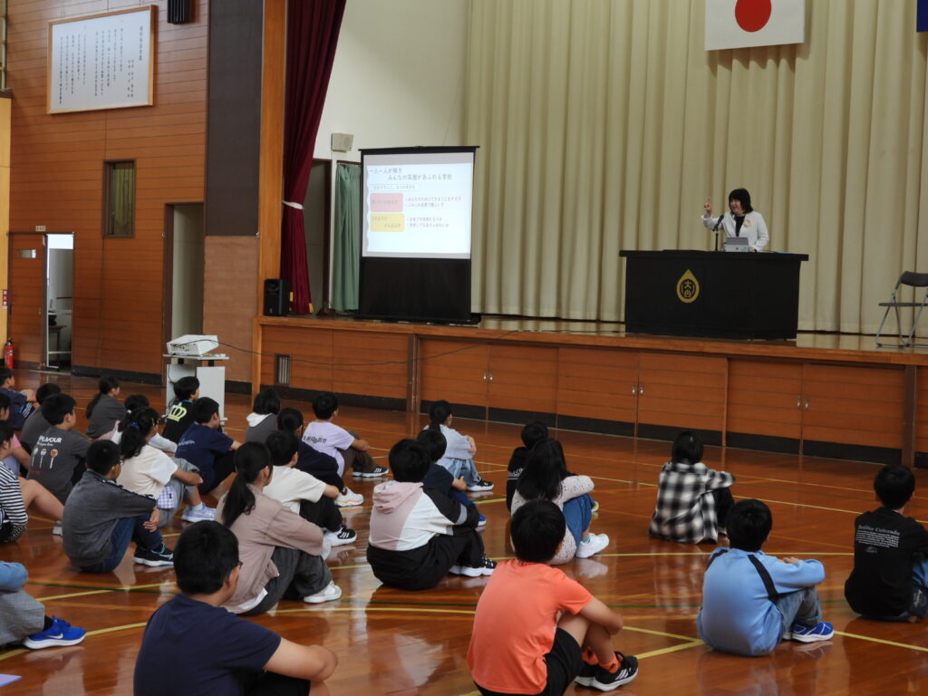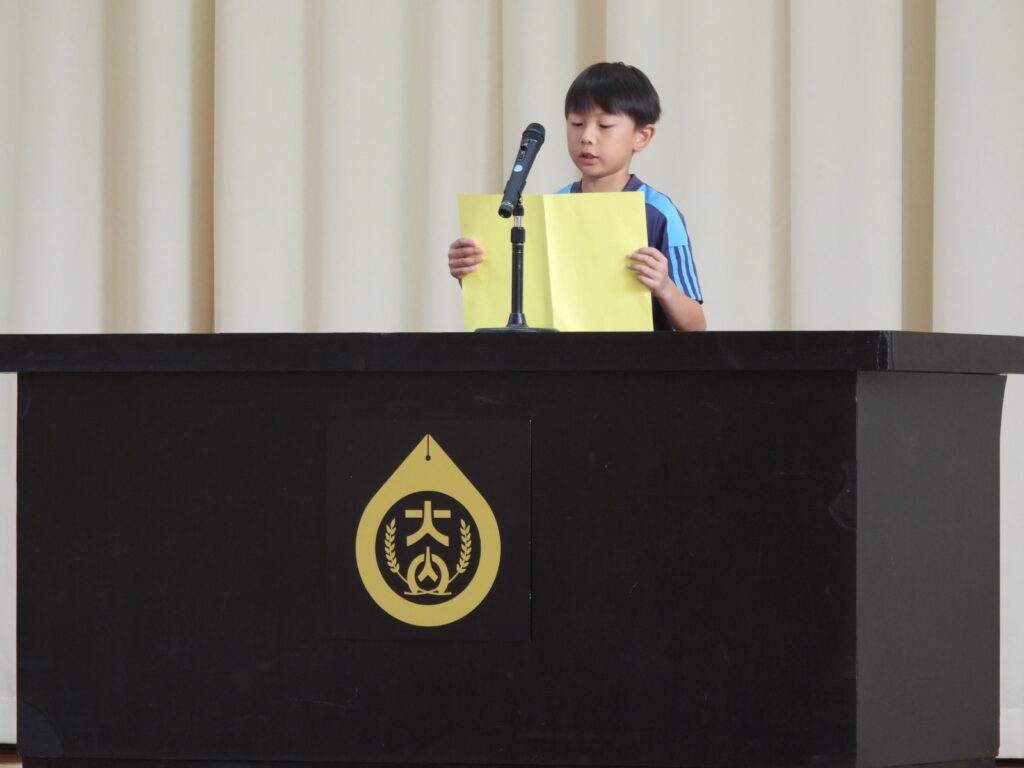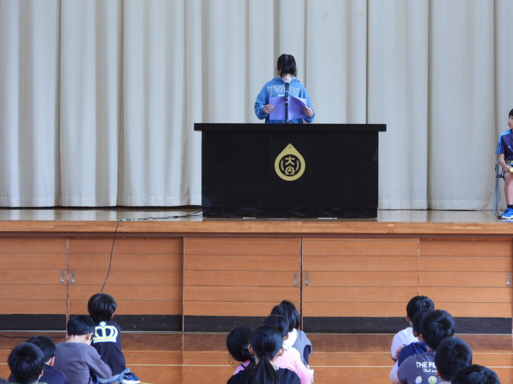 1時間目に前期終業式を行いました。はじめに4月からこれまでの大内小学校での楽しかった思い出を振り返り、各学年のがんばりを喜びました。さらに、大内っこ子どもアンケートの結果から、学校が楽しい、勉強が楽しいと感じている人が去年より増えていることが分かり、楽しい大内小学校をつくろうと一人一人ががんばったことも喜びました。全校のみんなでたくさん喜んで、前期を終わることができることはうれしいことです。また、2年生と6年生の代表が前期の振り返りを発表しました。後期に向けて意欲が見える発表でした。