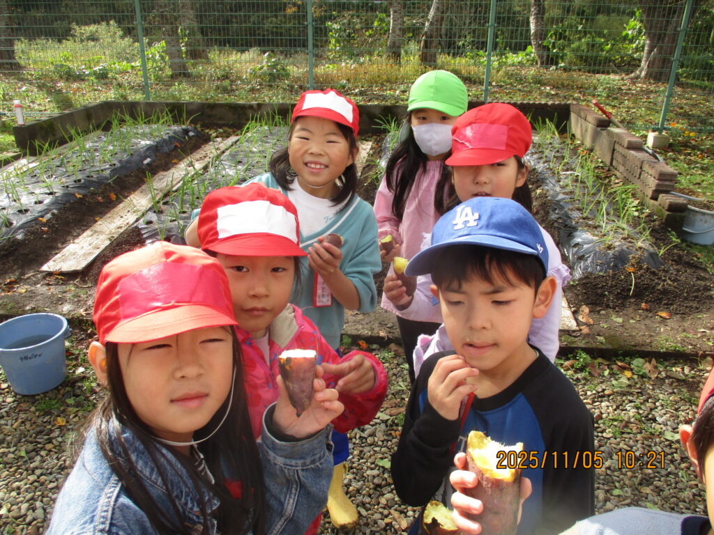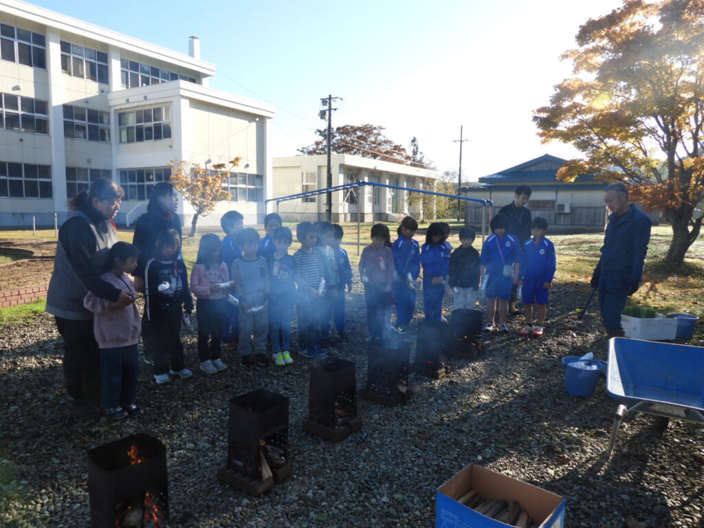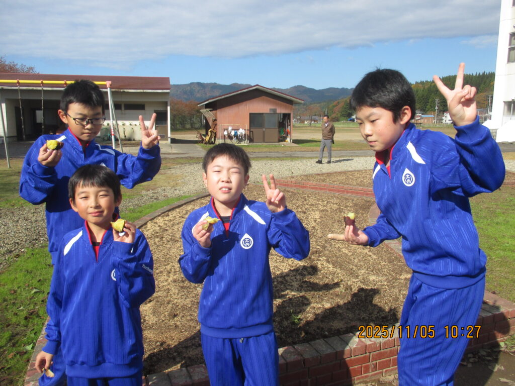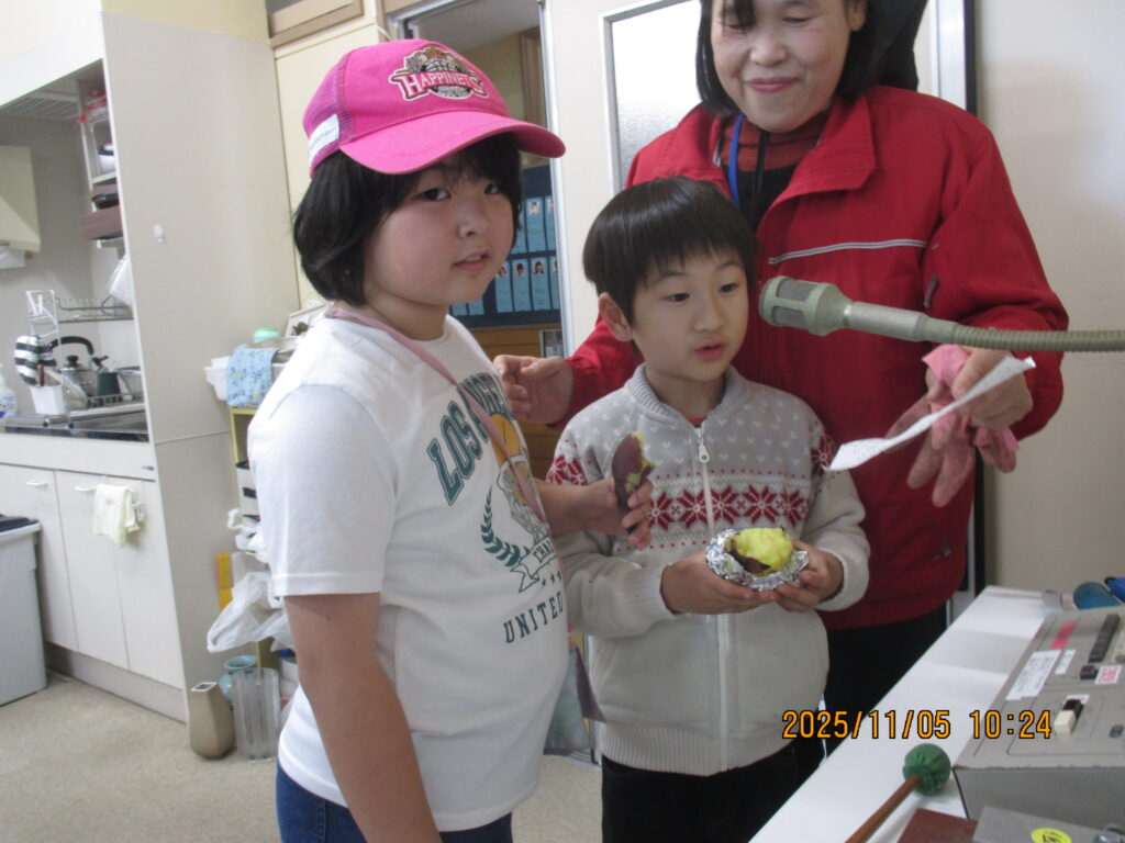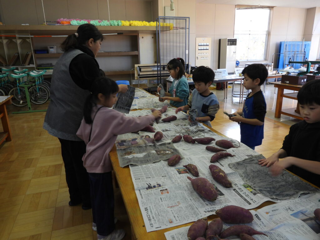 1年生と2年生が畑で育てたサツマイモでやきいもパーティーをしました。朝から、校務員さんの力をかりて、やきいもの準備をし、熱々のやきいもをみんなで食べました。たくさんできたので、長休みに校内放送で、「やきいもStationを開くので、食べたい人はスマイル広場に来てください」と呼びかけると、たくさんのお兄さんお姉さんたちが集まりました。日頃から縦割り活動や登校班等でお世話になっている上級生に喜んでもらうことができて、1.2年生も大満足でした。