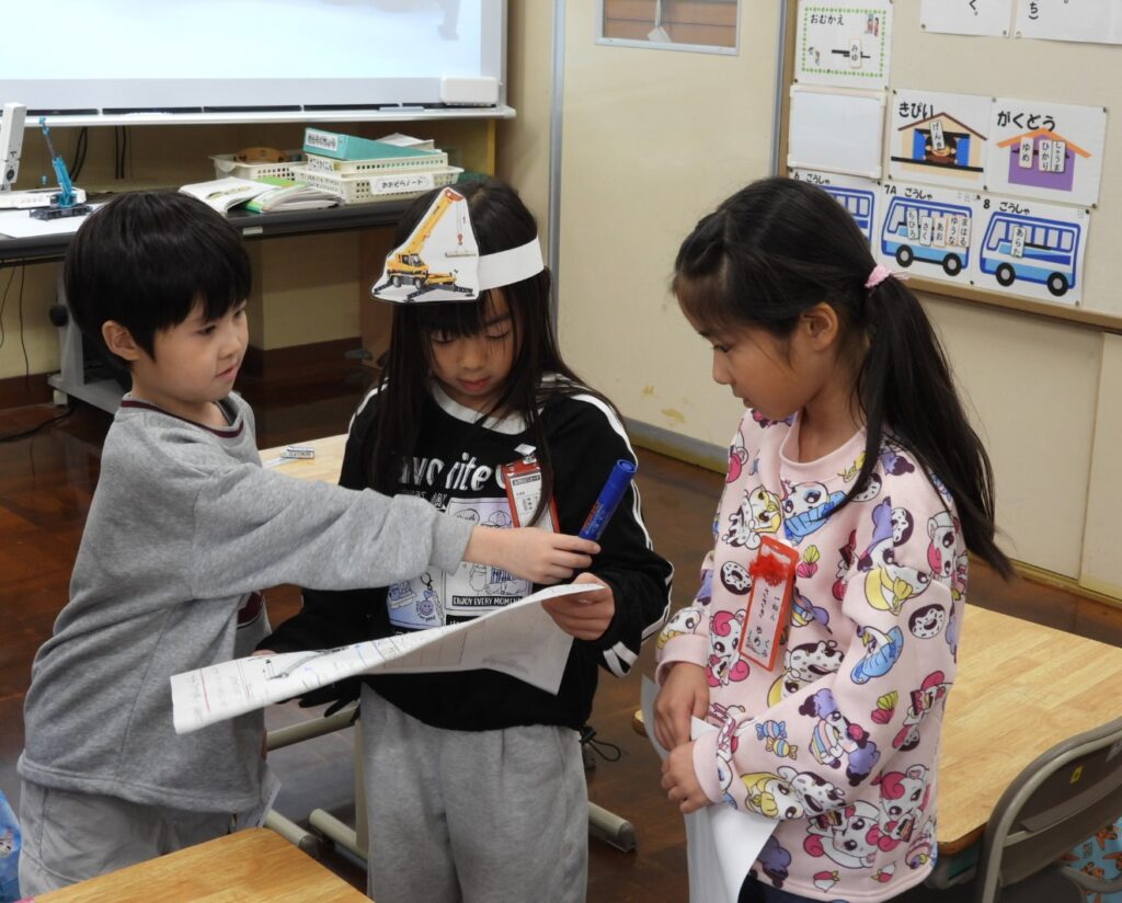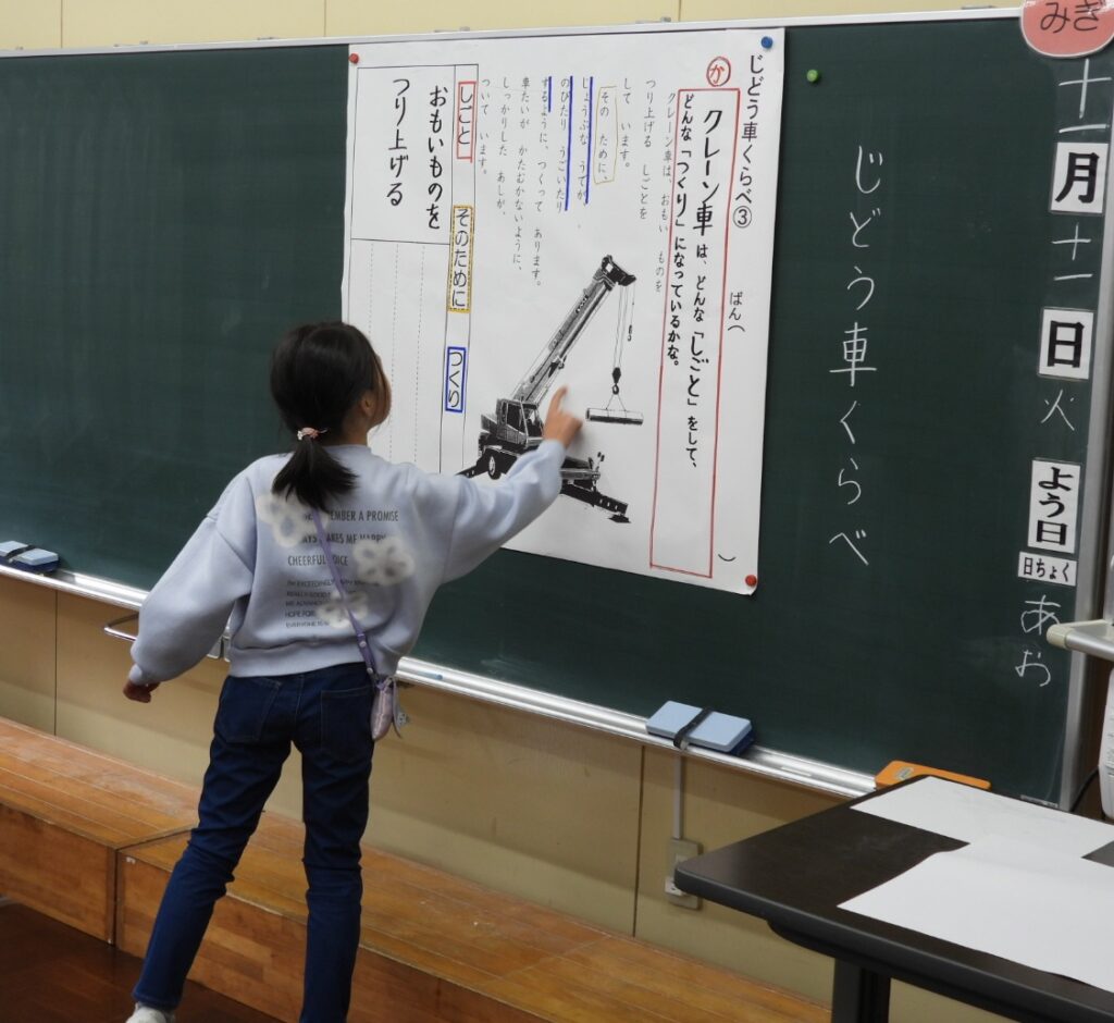 先生方が、1年生の国語の授業参観を通して、日頃の授業づくりについて考える勉強会を開きました。入学してから半年が経ち、学習体験をたくさん積み重ねてきた1年生は、読むことも書くことも大きく成長していました。さらに、クレーン車になりきって自慢話をしたりインタビュアーになって自慢について質問したりし、友達と学び合う楽しさも感じることができるようになっていました。1年生で身につけたい「学ぶことを楽しむ力」を具体的な姿として感じることができ、充実した研修の場となりました。