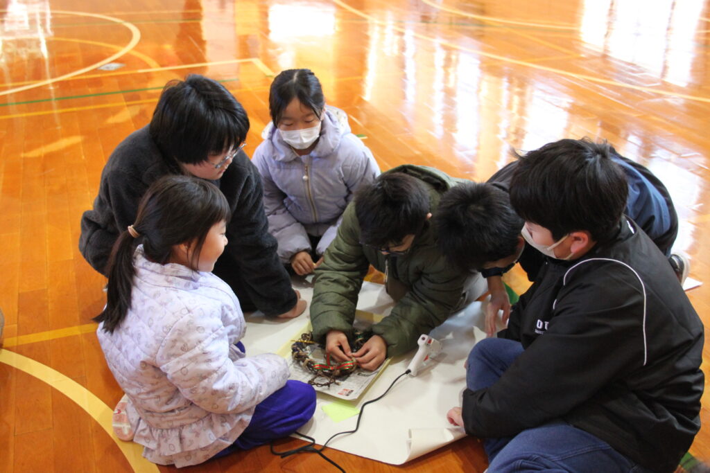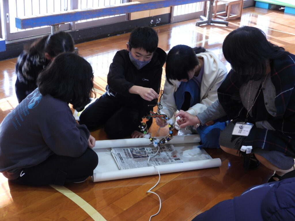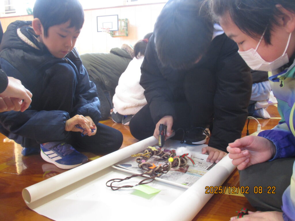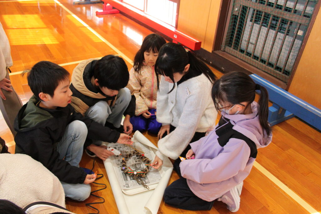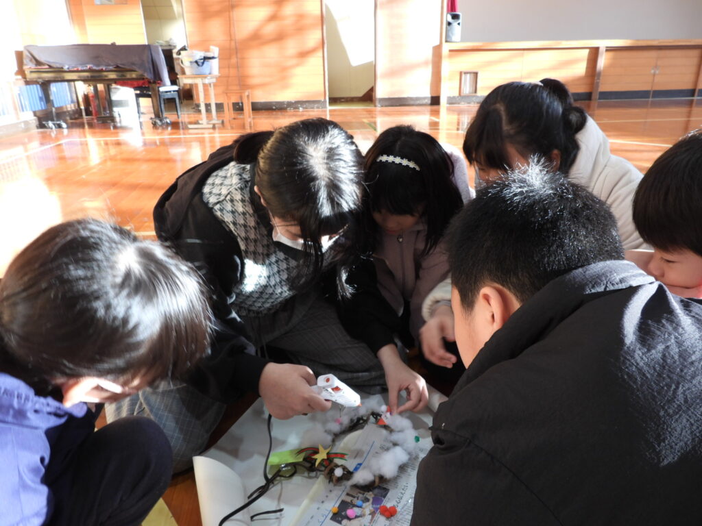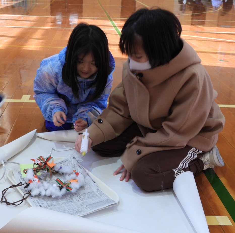 校務員さんが、1・2年生が育てたサツマイモのツルでリースを作ってくださいました。そこで、計画委員会の企画で、なかよし班(縦割り活動班)でクリスマス用に飾り付けをし、玄関ホールに飾ることにしました。5・6年生がホットボンドを使って、みんなの意見を聞きながら、作業が行われていきます。朝の短い時間でしたが、素敵なクリスマスリースが12個できました。