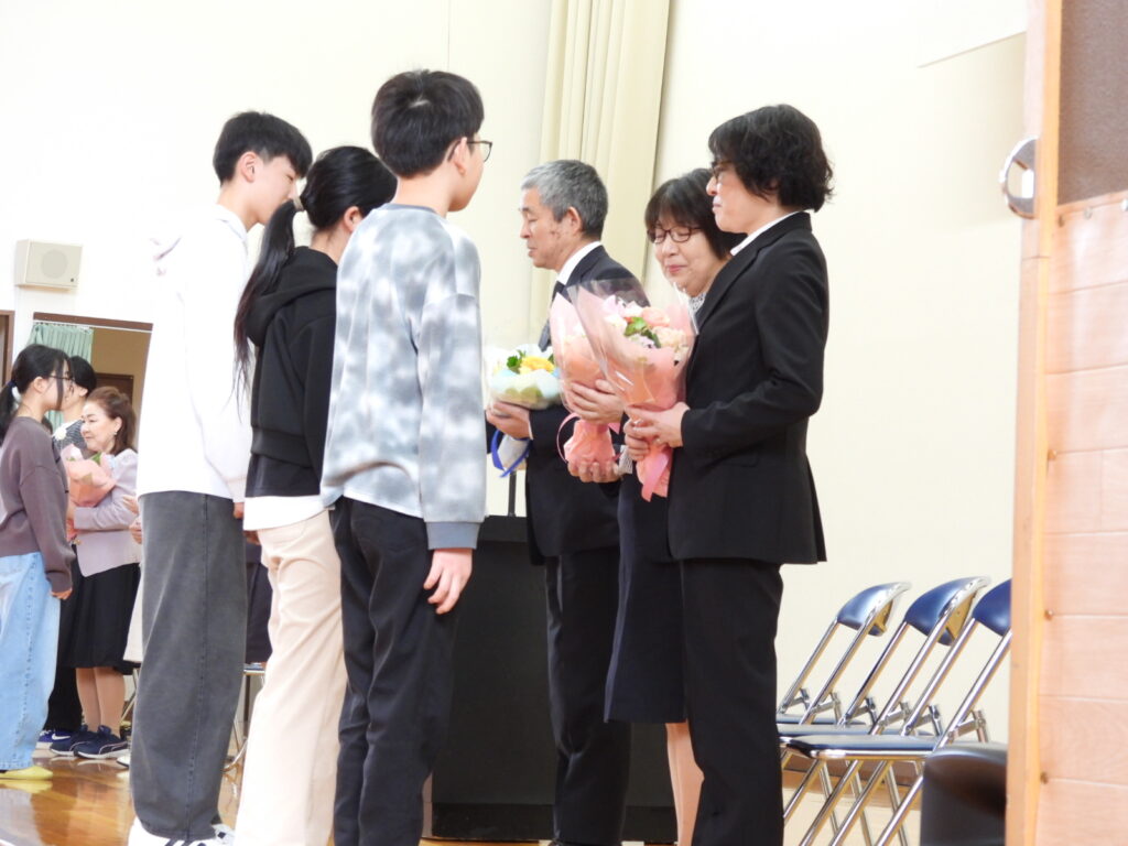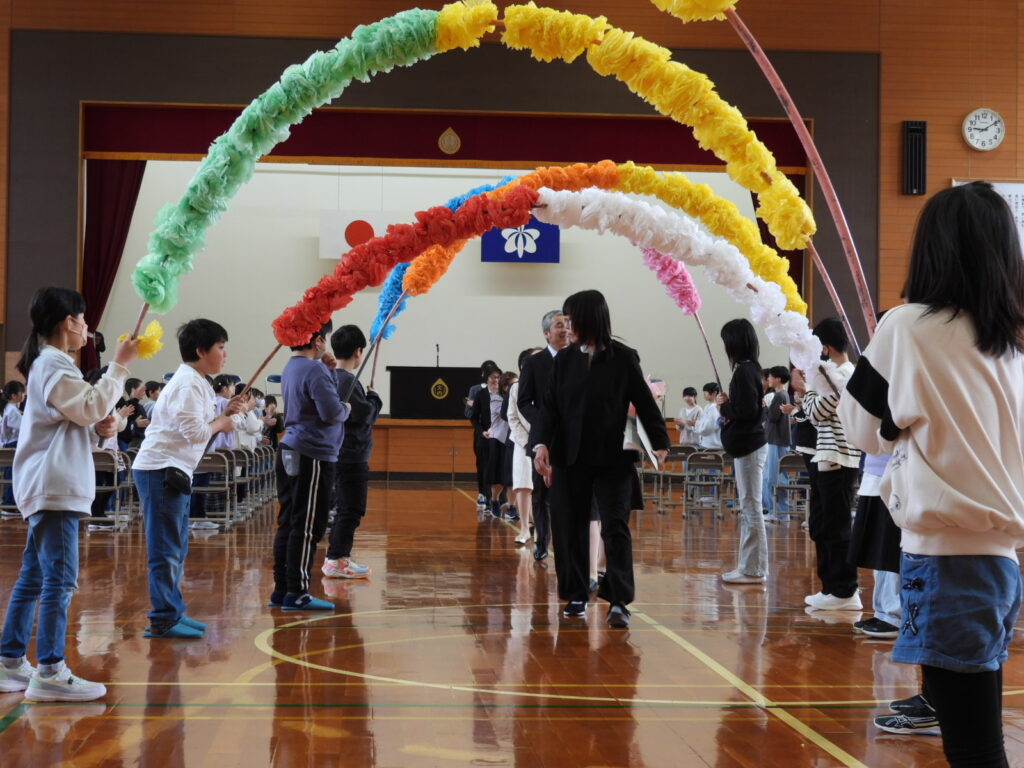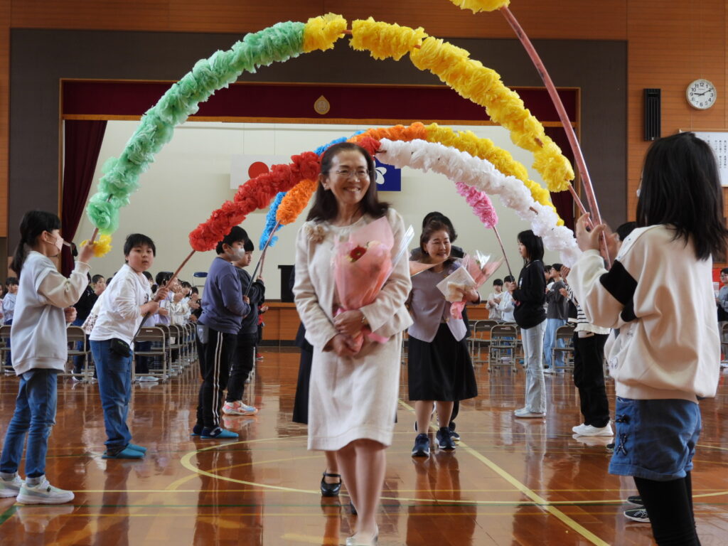 この度の人事異動により、7名の職員の方々とお別れすることとなり、お別れの会を開きました。お別れする先生方から励ましの言葉をいただき、みんなで校歌を歌いました。会の最後には、全校児童で花のアーチと花道をつくり見送りをしました。お別れする皆様にはたくさんの愛情をいただきました。ありがとうございました。
