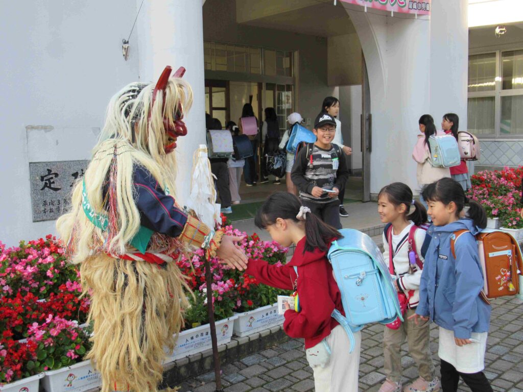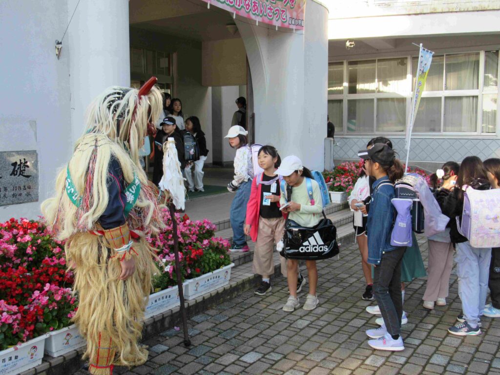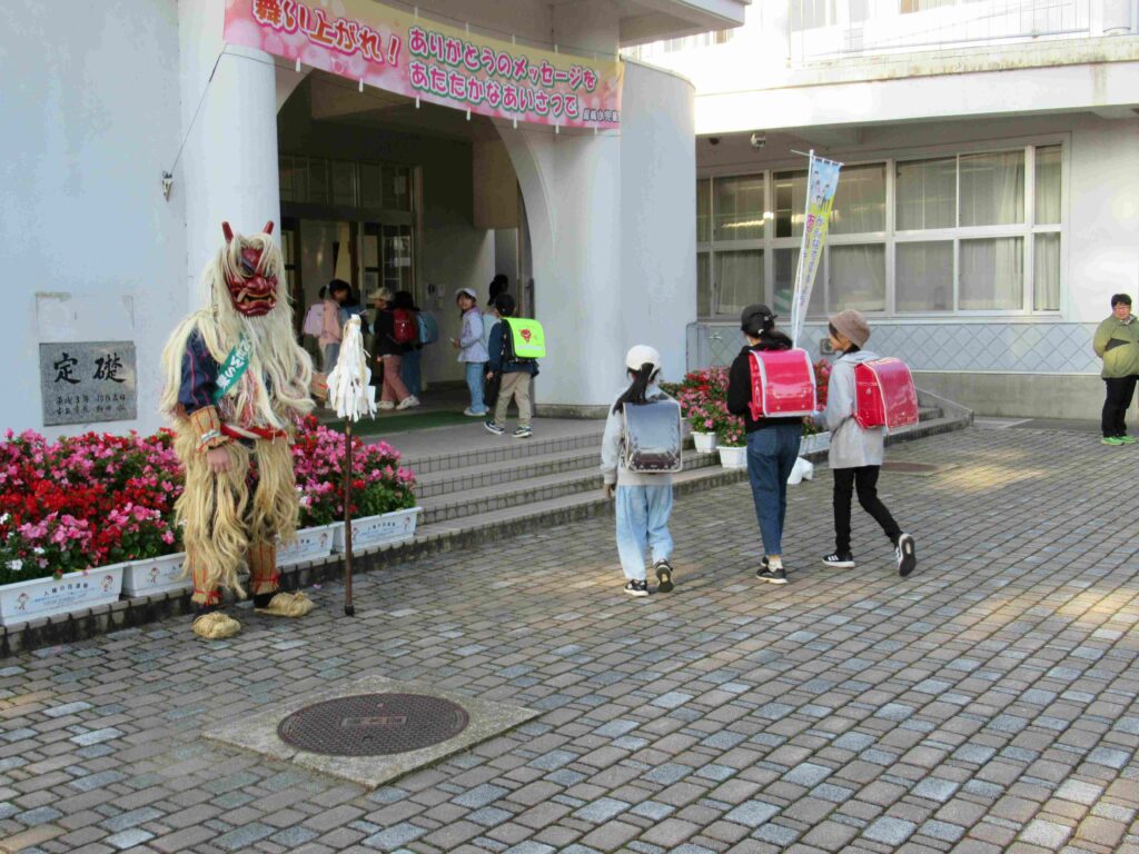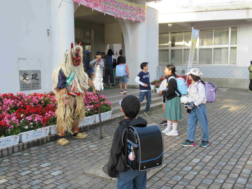 10月15日(水)の登校は、なまはげさんと由利本荘警察署の皆様に見守られました。さわやかに「おはようございます」とあいさつができる子どもが多いおざきっ子が自慢です。なまはげさんの登場に、少々戸惑う様子も見られましたが、しっかりあいさつができていました。朝の「おはようございます」は大切にしていきたいものですね。