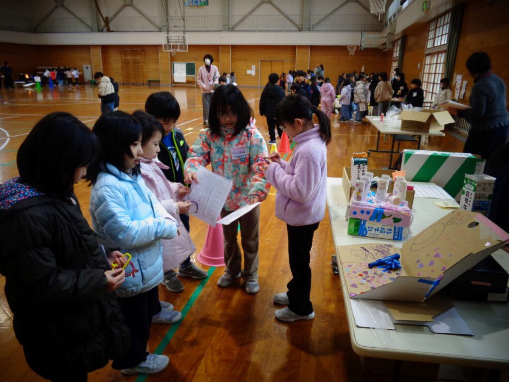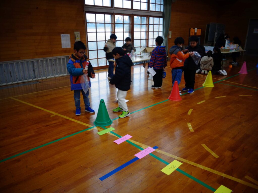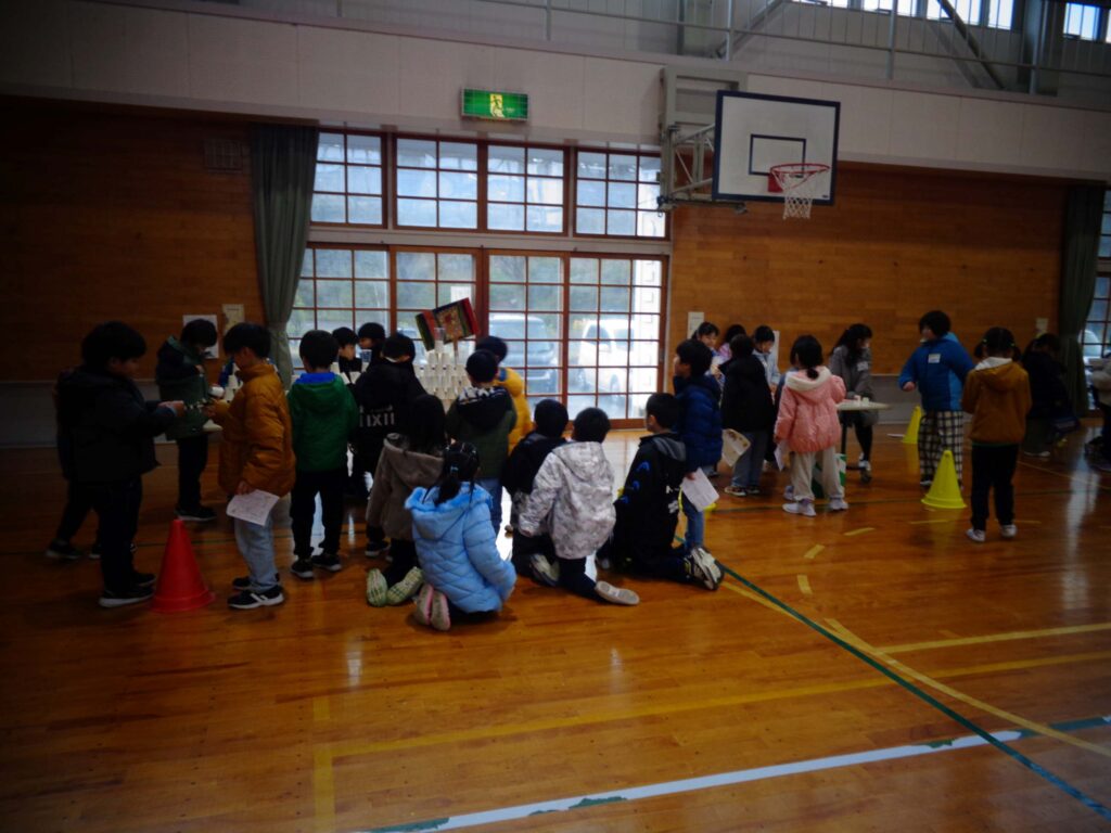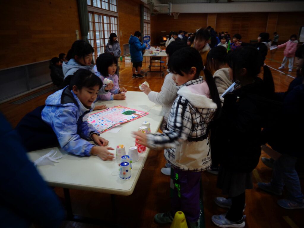 12月15日(月)、2年生が生活科の学習でつくった「スマイルランド」へ、1年生を招待して一緒に楽しみました。2年生は、身の回りにある材料を活用して、「ぐりぐりかめさん」「ビュンビュンカー」「ビリビリ糸でんわ」など、10種類以上のおもちゃを作りました。1年生は、2年生からもらったスマイルランドの地図をもっていろいろなコーナーで遊びを楽しみました。この日はとても寒かったのですが、体育館の中は1年生と2年生の笑顔でつつまれ、温かい雰囲気の学習となりました。