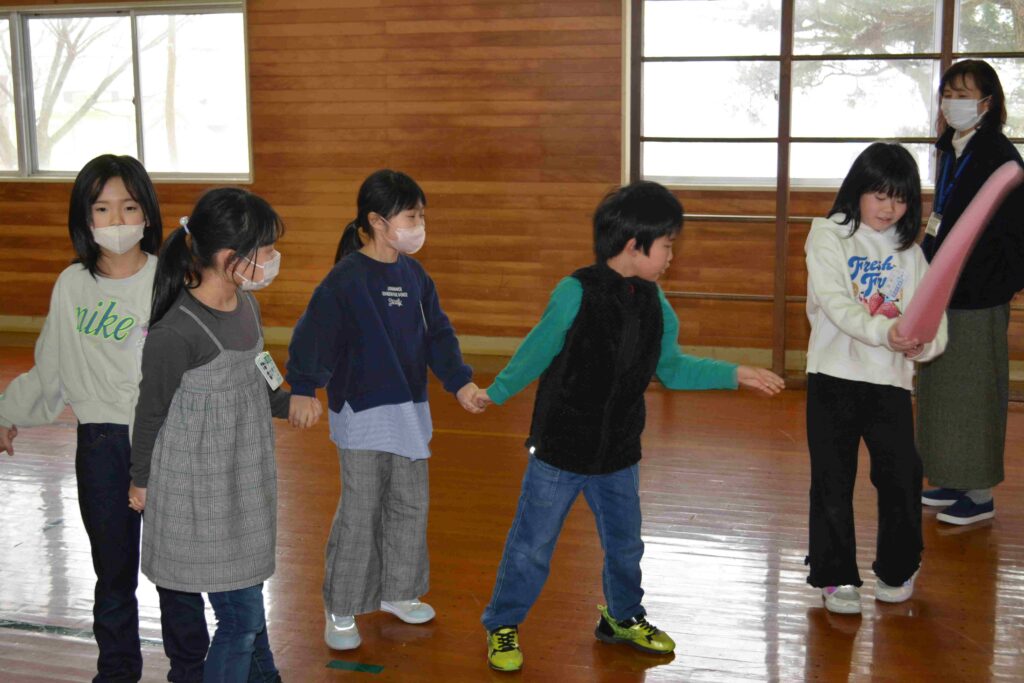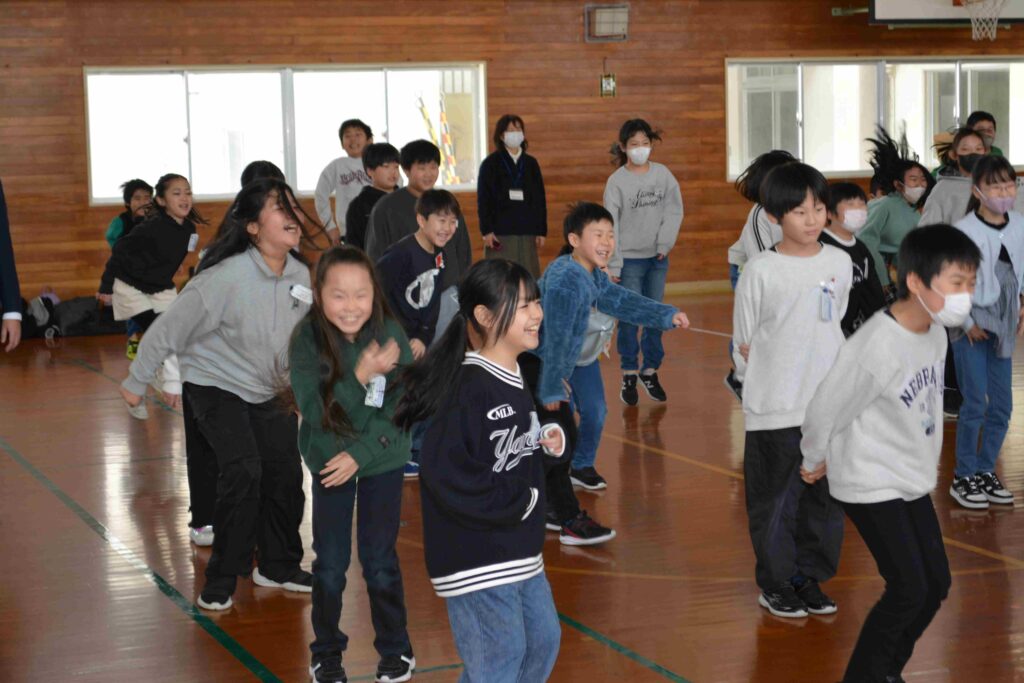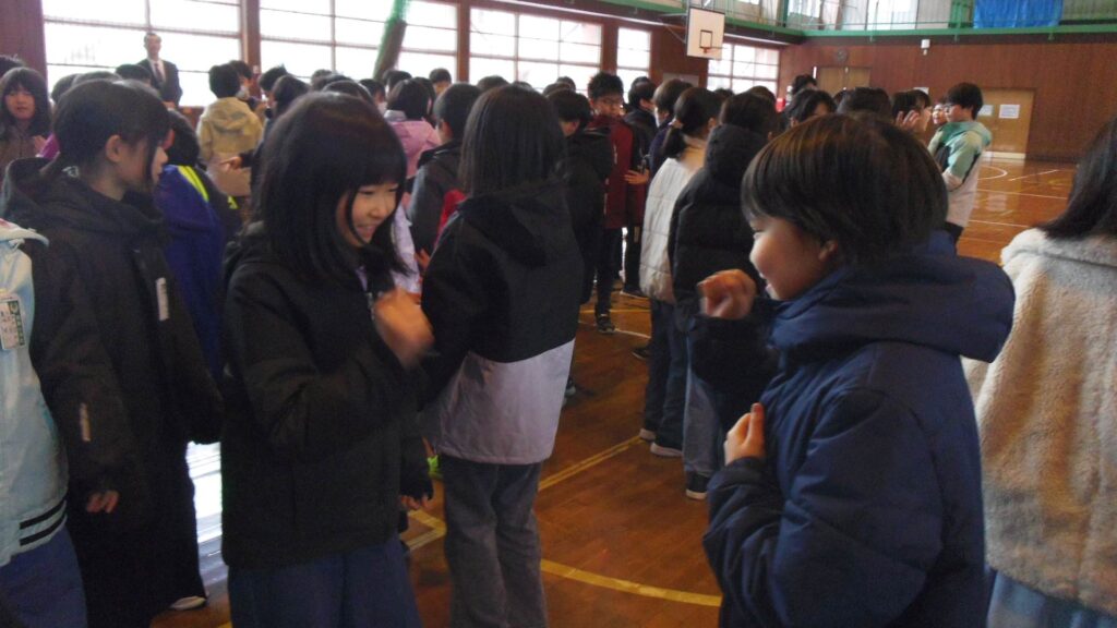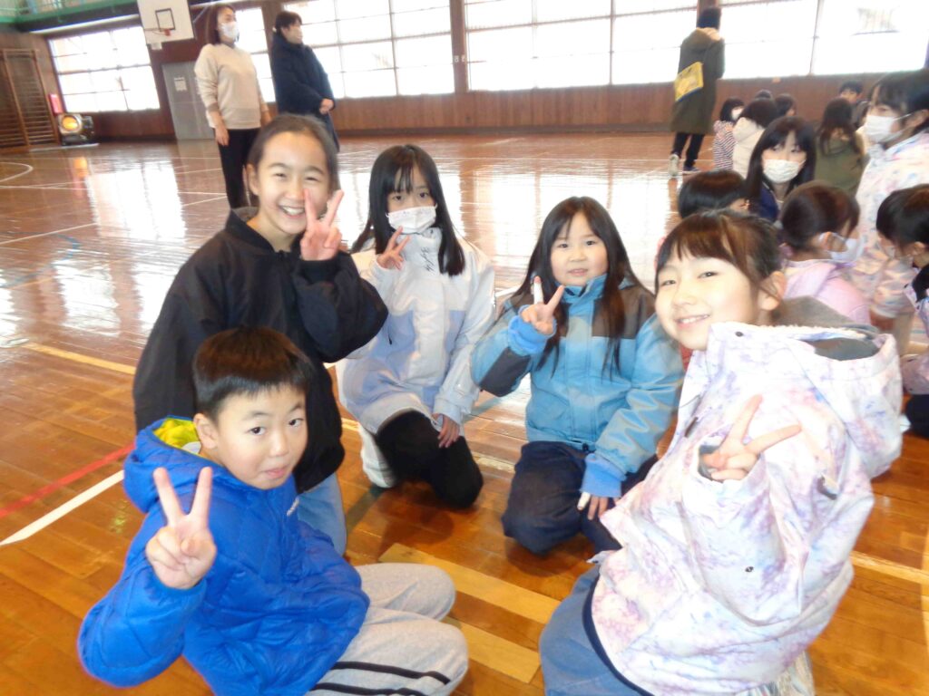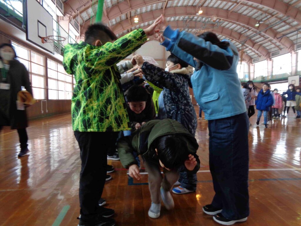 来年度から、1年生から5年生は、2つの学校に分かれて学ぶおざきっ子。この1月に、現鶴舞小学校、子吉小学校、小友小学校の友達と交流する会を行いました。どの学年も、岩城少年自然の家指導員の方から交流ゲームを教えていただきながら楽しみました。