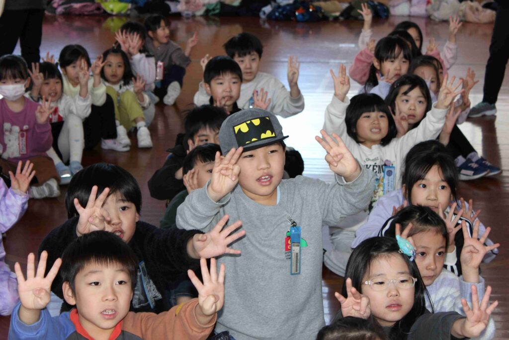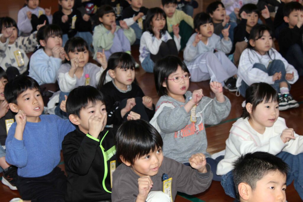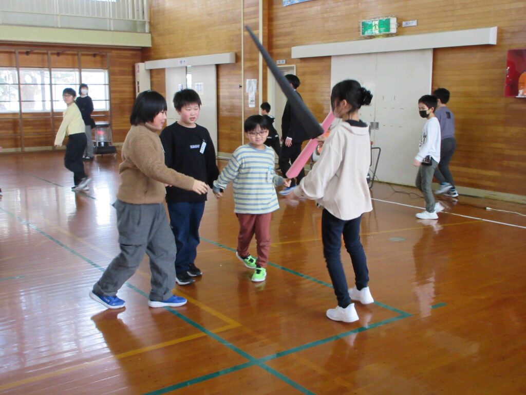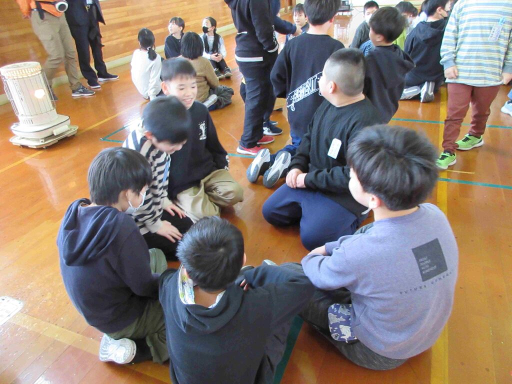 来年度から、1年生から5年生は、2つの学校に分かれて学ぶおざきっ子。この1月に、現鶴舞小学校、子吉小学校、小友小学校の友達と交流する会を行いました。どの学年も、岩城少年自然の家指導員の方から交流ゲームを教えていただきながら楽しみました。