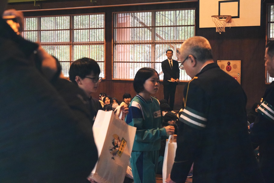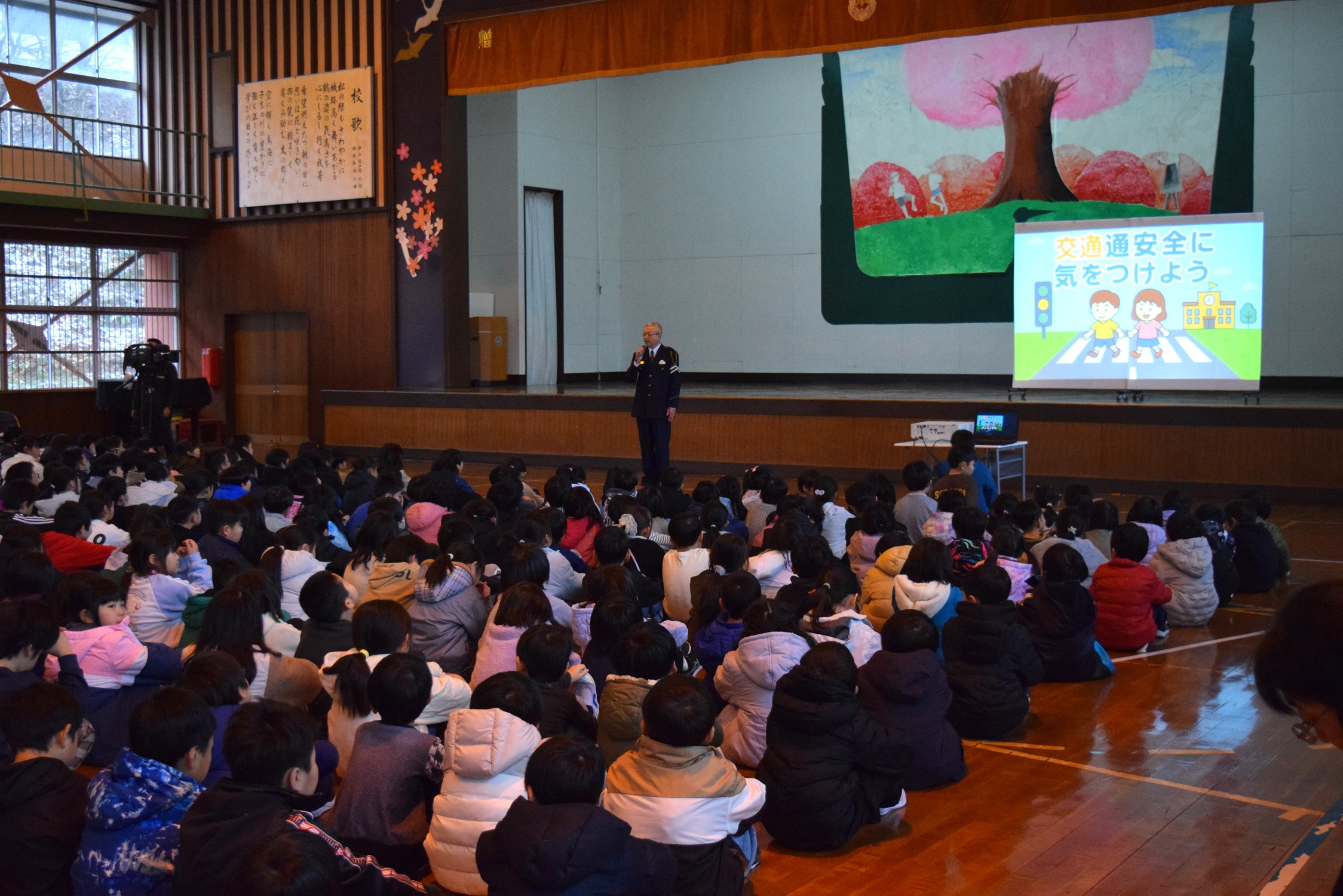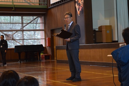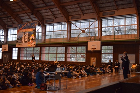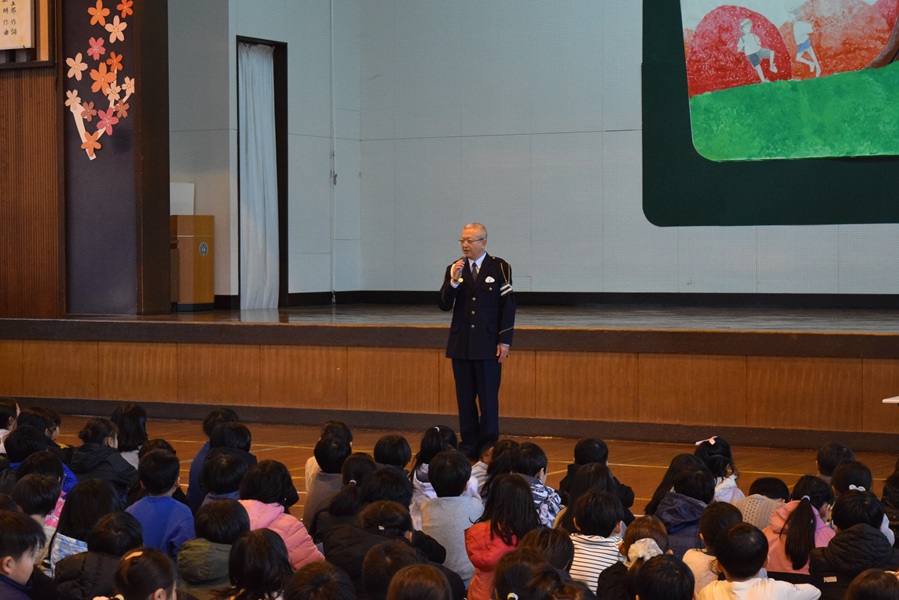 また、毎年12月10日に行われる交通安全を誓う会において、縦割り活動で作った交通安全折り鶴メッセージカードを警察署長に贈呈したり、交通安全宣言をしたりするなどの活動も継続しています。