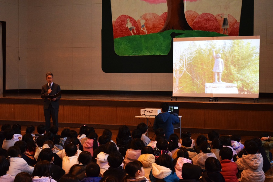 1975年12月10日、本校の1年女子が交通事故で歩道を歩いて帰宅中、ダンプカーによる事故に巻き込まれ亡くなりました。当時のPTAの方々は、このような悲劇を二度と繰り返さないよう、学校全体で交通安全を強く意識する取組を始めました。その一つとして、後に鶴舞小学校38代の校長先生となる冨山先生にお願いして、正面坂の上にある「女の子のブロンズ像」を作っていただきました。この像は、交通安全の大切さを私たちに伝え続けています。
