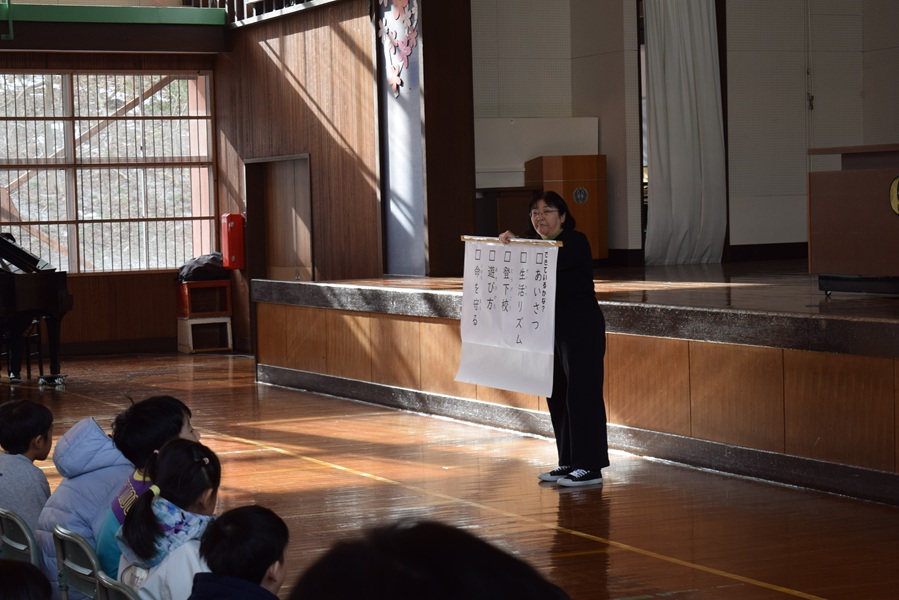 寒い体育館でしたが、全校児童が集まり、新年のあいさつをした後、歌う機会が限れている「校歌」を歌いました。児童会目標にも「校歌を1回1回大切に歌おう」とあります。この校舎で過ごすわずかな期間を大切にしてほしいと思います。