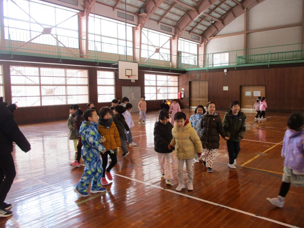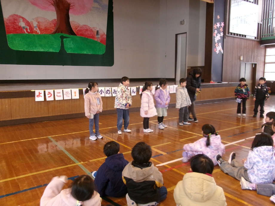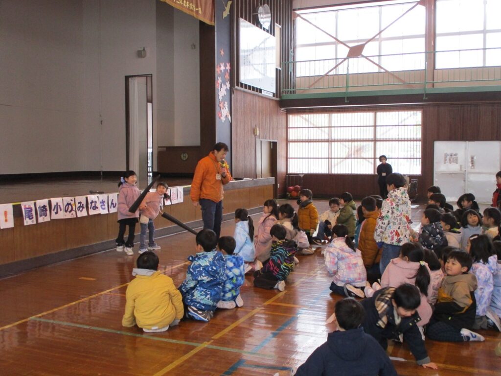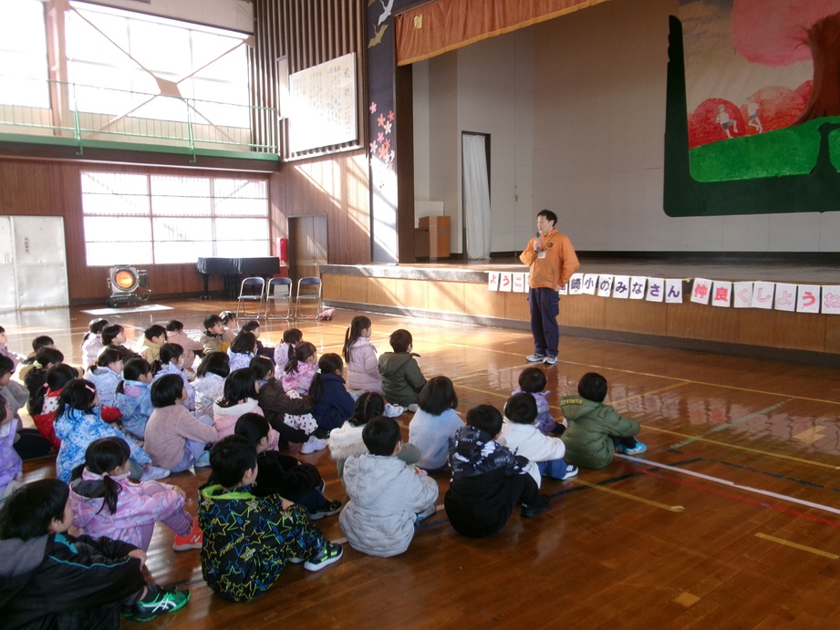1年生が統合する尾崎小1年生と岩城少年自然の家の出前講座を活用して交流しました。