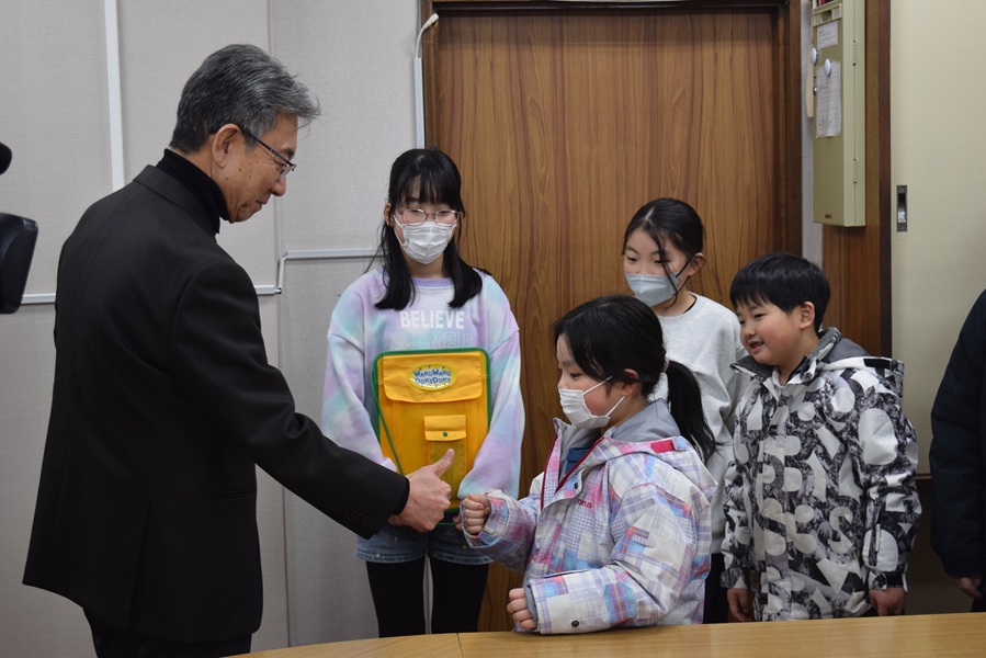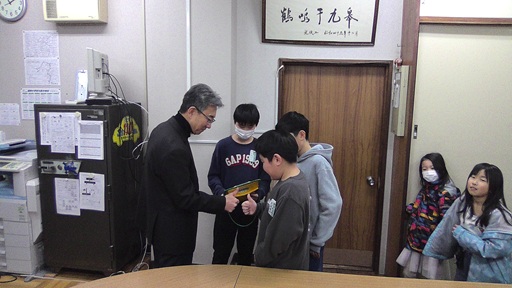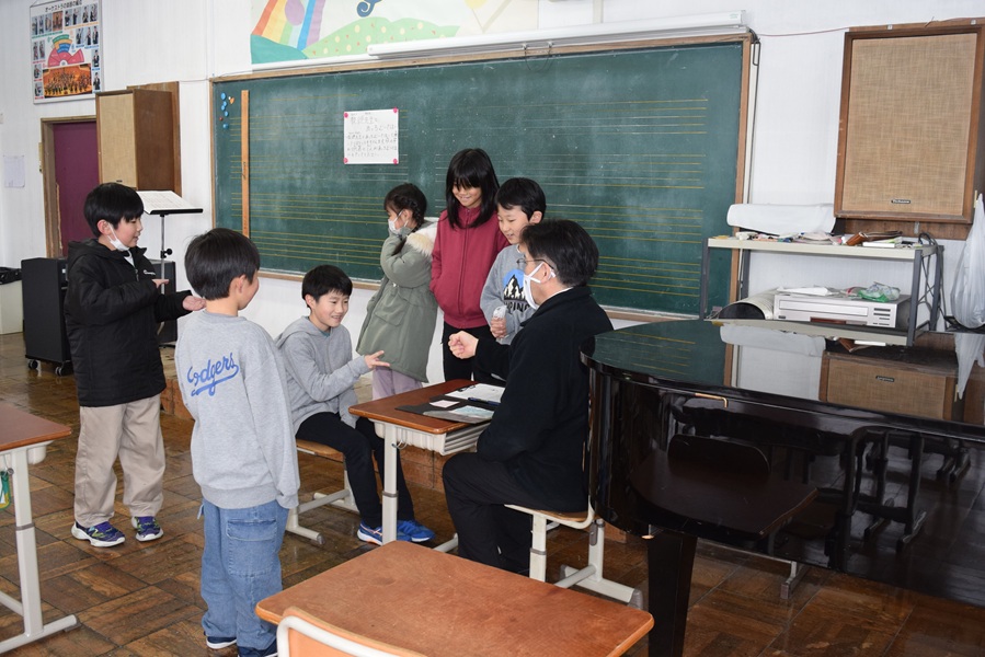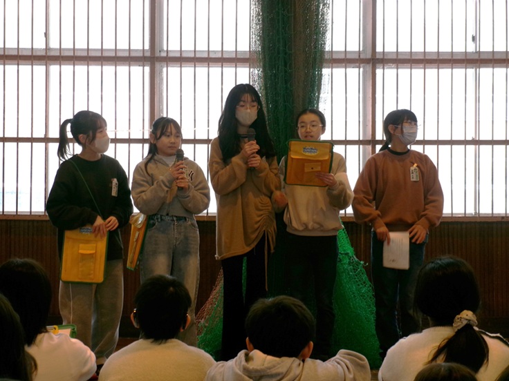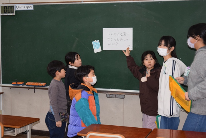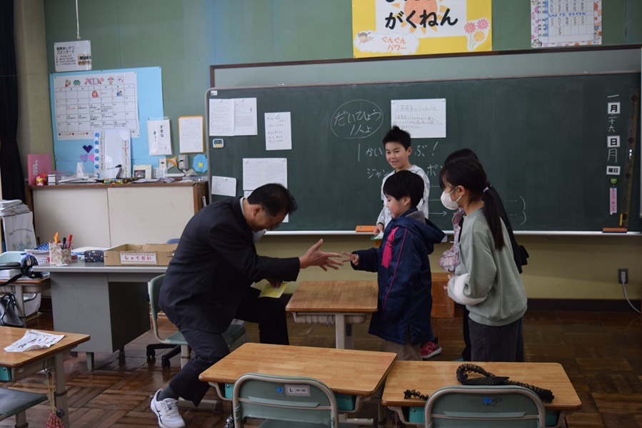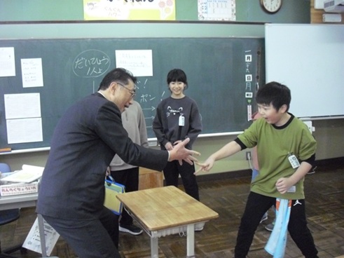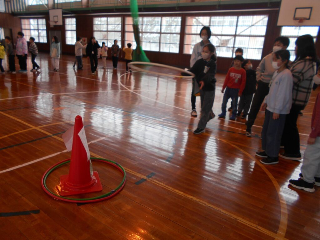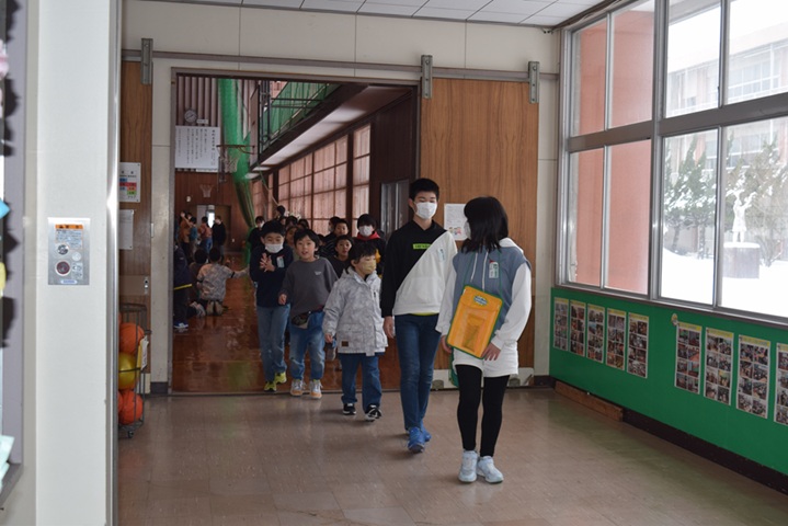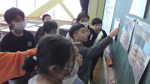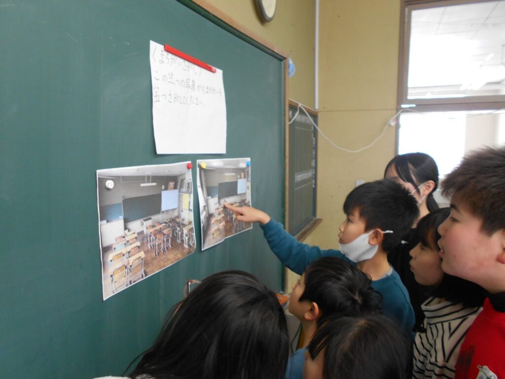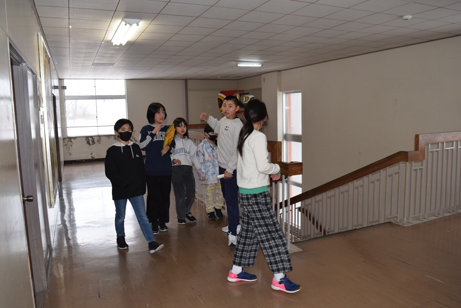 「縦割り班のメンバーと一緒に校舎と触れ合うことで、最後の校舎に感謝の気持ちをもつ」というねらいで、実施されたポイントラリー。ラリーの内容は、6年生の実行委員が決め、準備や運営も行いました。48の縦割りグループが、体育館を出発し、25カ所のポイントでゲームやクイズなどを楽しみながら校内を歩き回りました。「ギャラリーの鉄棒の数は?」「体育館ステージの絵には人は何人いる?」「つるたんの正式な名前は?」「校舎は個々に移転して何年?」など校舎にまつわるクイズもありました。
