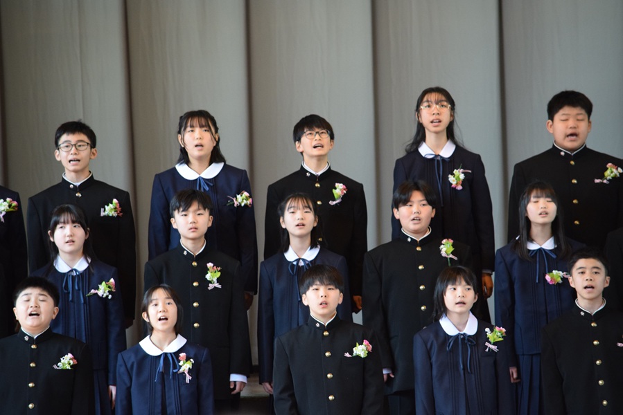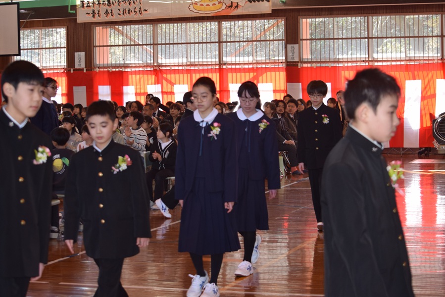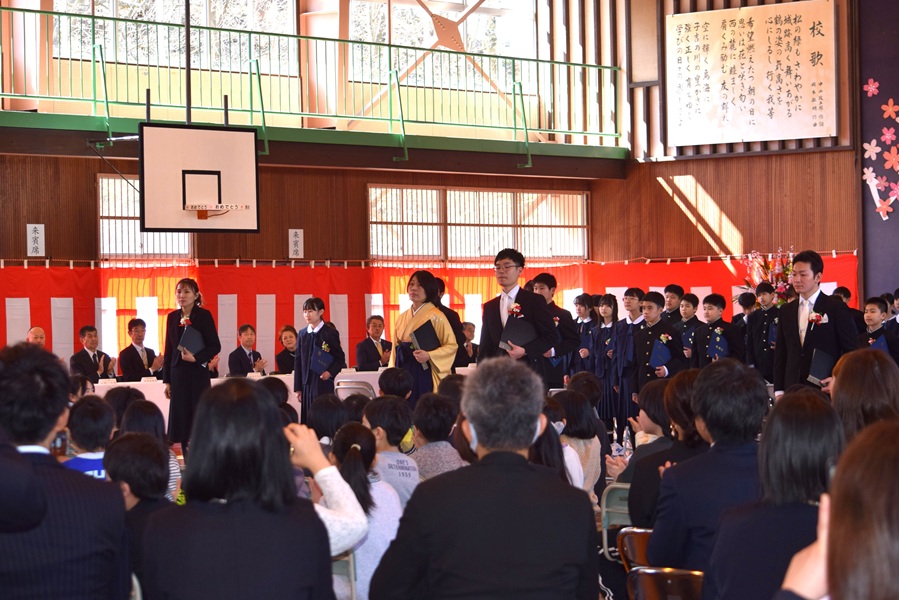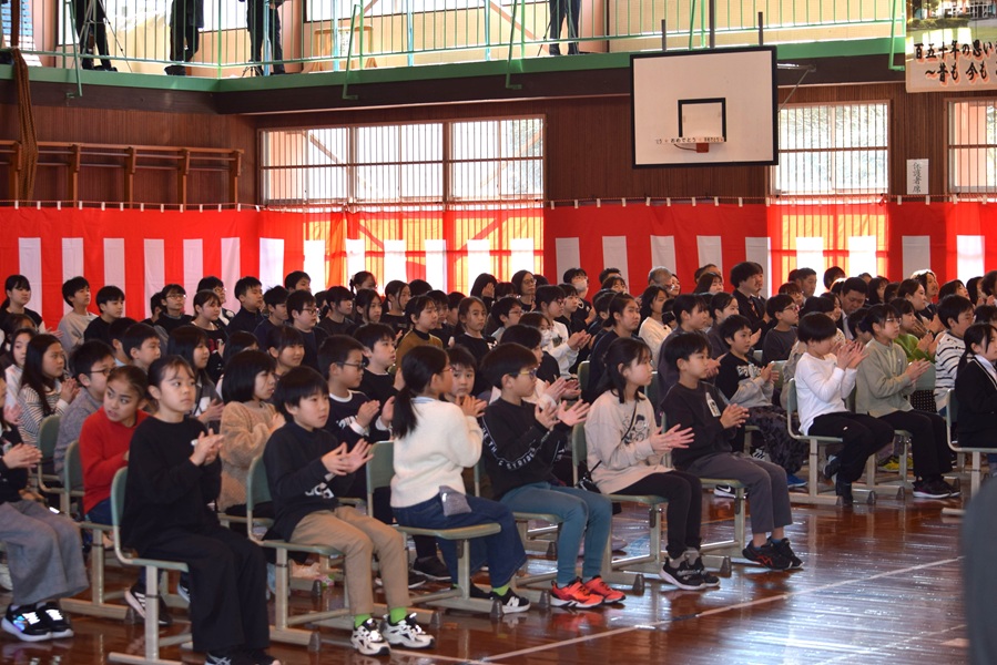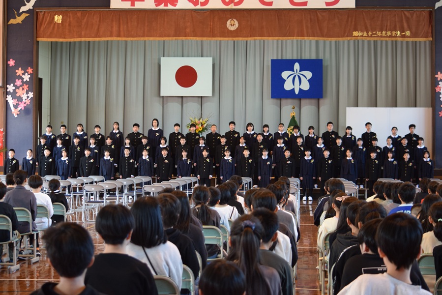 春の光が差し込む晴天の下、百五十二年の長きにわたり地域とともに歩んできた鶴舞小学校の卒業生六十六名の皆さんが、水林の学び舎最後の卒業生として卒業しました。