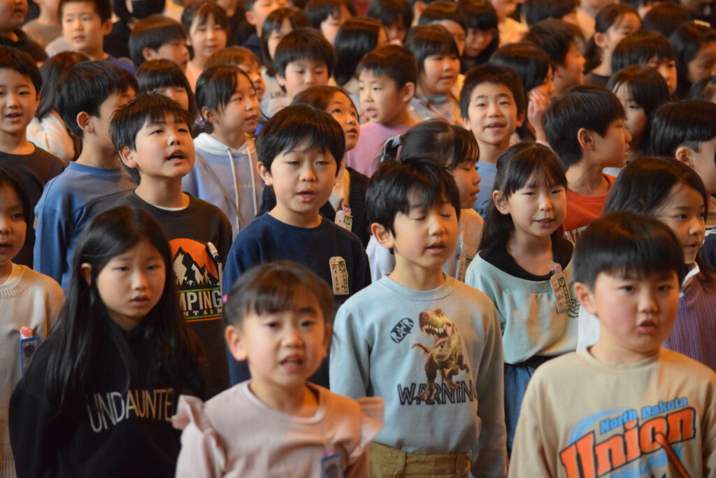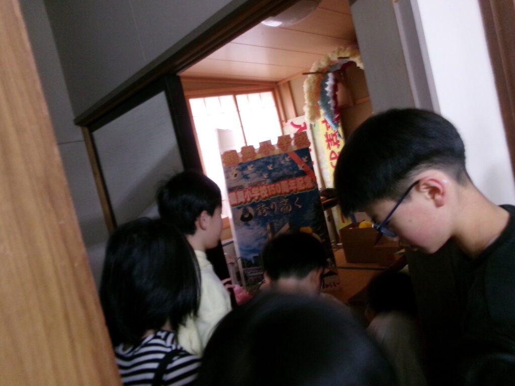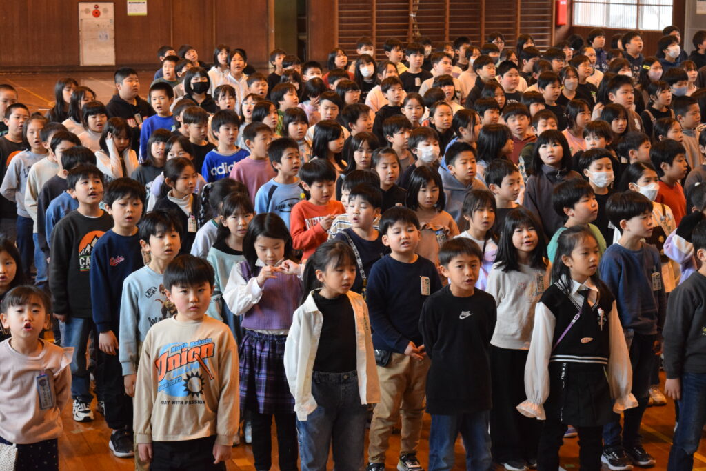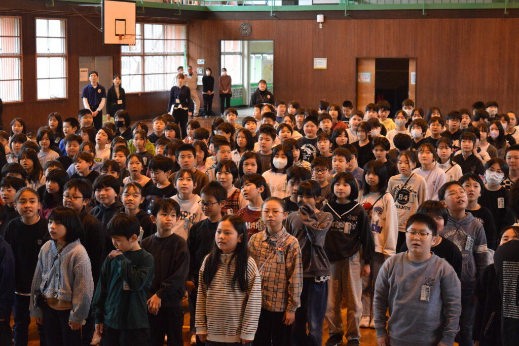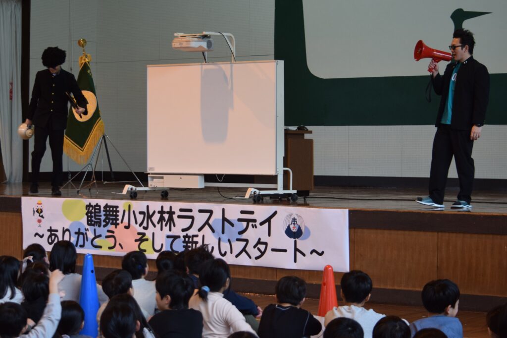 鶴舞小学校水林校舎での最後の一日が幕を閉じました。職員が本気で準備した「鶴舞校舎アドベンチャー『学校かくれんぼ』」を皮切りに、「体育館でステージを背景にした記念撮影」「職員との別れ」「校旗引継」「最後の校歌合唱」へと、温かくも濃い時間となりました。最後は、子どもたち一人一人が「感謝」と「未来への一言」を発し、職員全員での見送りでラストデイを締めくくりました。