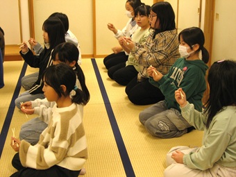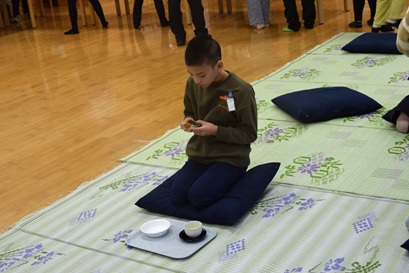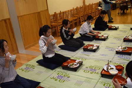 11月24日の「和食の日」に合わせ、5年生の「和食マナー教室」を実施しました。午前中に、校内にある和室で、地域の講師の先生方お二人から、和食のマナーについて教えていただきました。そして、いよいよ食事の時間になりました。お膳には、ごはん、五目煮、麩のすまし汁に加え、なんと1匹の骨付きサンマの塩焼きまであります。子どもたちは、箸の使い方や食器の持ち方、魚の食べ方などのマナーに注意しながら味わいました。最後には、お茶と地元の菓子店で作ってくださった「虎の子まんじゅう」もいただきました。最初はやや緊張している様子も見られ、サンマの食べ方に悪戦苦闘している人もいましたが、おいしい食事にだんだん笑顔になり、楽しみながら食べる姿が見られるようになりました。サンマのはらわたの部分は、ちょっぴり苦くて苦手だったようですが、いつの日か「ここがおいしいんだよ」と言える日がやってくるかもしれませんね。今回の学習は、おいしくいただきながら、和食について知り、考える、よい機会になりましたね!