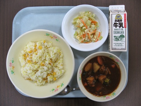 今日の給食は「フランスメニュー」で、献立は、バターコーンライス、チーズサラダ、ブラウンシチュー、牛乳でした。フランスは「食の国」とも呼ばれ、料理やお菓子がとてもおいしいですね。フランスパンは有名ですが、料理でも、スープやシチュー、肉料理など、とても多様です。今日の給食では、ブラウンシチューが登場しました。ブラウンシチューは、肉や野菜をじっくり煮込んで、デミグラスソースで味を付けています。温かくて、寒いこの時期にぴったりでした。矢島小の給食時間は、先週のスペインに続き、今週もヨーロッパを巡っています。今日も「メルシ プール ル レパ!」
