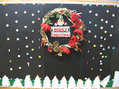 もうすぐクリスマスですが、図書室前の掲示板や入口の戸にも、クリスマスらしい飾りが登場しました。掲示板の飾りは学校司書の先生が、また、戸に貼り付けている飾りは2年生の児童がビーズで作ってくれたものです。どちらもすてきですね!