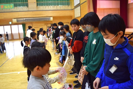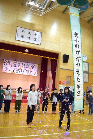 5年生が中心となって準備した「6年生を送る会」がありました。最初に、6年生がアーチをくぐって入場しました。次に、1年生と2年生の子どもたちが、感謝の一言を添えながら6年生にプレゼントを渡しました。そして、3~5年生は元気なダンスや歌を贈りました。思い出の写真をスライドショーで6年間を振り返った後は、いよいよくす玉割りです。「5、4、3、2、1、0!」のカウントダウンの後、きれいに割れて見事に花吹雪が舞いました。短い時間でしたが、1~5年生の温かい気持ちがギュッと詰まった会になりました。また、6年生の笑顔がたくさん見られるすてきな会でした。企画・事前準備・当日の運営にしっかりと取り組んだ5年生と、準備をがんばった1~4年生の子どもたちに感謝したいと思います。