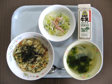 今日の給食には、6年生によるリクエスト「副菜部門第2位」だった「春雨サラダ」が登場しました。春雨サラダはさっぱりとしていて、いろいろなおかずと相性がよく、人気がありますね。また、今日は「キンパ風まぜごはん」も登場しました。「キンパ」とは日本で言う「のり巻き」のことで、韓国風に味付けされたごはんが特徴です。給食では、のりで巻く代わりにきざみのりを混ぜています。ゴマの風味が感じられてとてもおいしかったです。