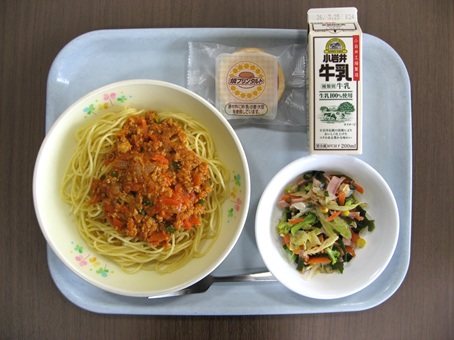 今日の給食には、6年生によるリクエスト「主食部門第2位」だった「ミートソーススパゲッティ」、「副菜部門第1位」だった「元気サラダ」、「デザート部門第2位」だった「タルト(焼きプリンタルト)」の3品が登場するという、スペシャルメニューでした。そして、6年生にとってはこの日の給食が小学校生活最後の給食となりました。きっと、味わって食べたことでしょう。