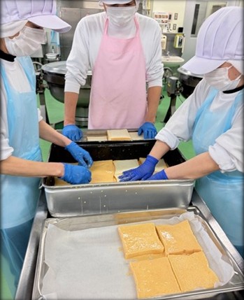 今日の給食の献立は、フレンチトースト、ジャーマンポテト、まめまめサラダ、肉団子のスープ、牛乳でした。そして、今日のフレンチトーストは調理員さんによる手作りです。食パンを一つ一つ卵液に付けてから焼き上げています。手間のかかる工程ですが、子どもたちのために丁寧に作ってくださいました。多くの方に支えられて、子どもたちはもちろん、職員も楽しみながら給食を食べることができています。本当にありがたいことだと思います。明日はいよいよ今年度最後の給食となります。改めて感謝の気持ちを大切にしながら味わいたいと思います。それでは全校の皆さん、心の中で伝えましょう。「1年間ありがとうございました! ごちそうさまでした!」