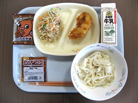 本日の給食は「大分県郷土料理メニュー」で、献立は、冷やしうどん、とり天、切り干し大根のサラダ、ととやき(チョコ)でした。大分県は鶏肉料理が豊富で、鶏肉の消費量が全国トップクラスだそうです。代表料理にとり天、とりめし、にわとり汁などがあります。また、小麦粉料理などの粉食文化が根差しているそうです。昔は米よりも麦の栽培が盛んな土地で、代表料理にだんご汁、やせうま(きな粉をまぶしたゆで麺)があります。そして、 海の幸と山の幸が豊富にあることも大きな特徴です。地形的に瀬戸内海に面し、新鮮な魚介類が豊富で、代表料理にはりゅうきゅうとよばれる魚の漬けがあります。さらに、 歴史と異文化の影響が大きいという特徴もあるそうです。今日のとり天は、全国的な鶏の天ぷらと違い、衣にもしっかりと醤油味がついているてんぷらになります。本場の大分では、かぼすをしぼったポン酢で食べています。地域の特色を意識しながら、今日もおいしくいただきました。